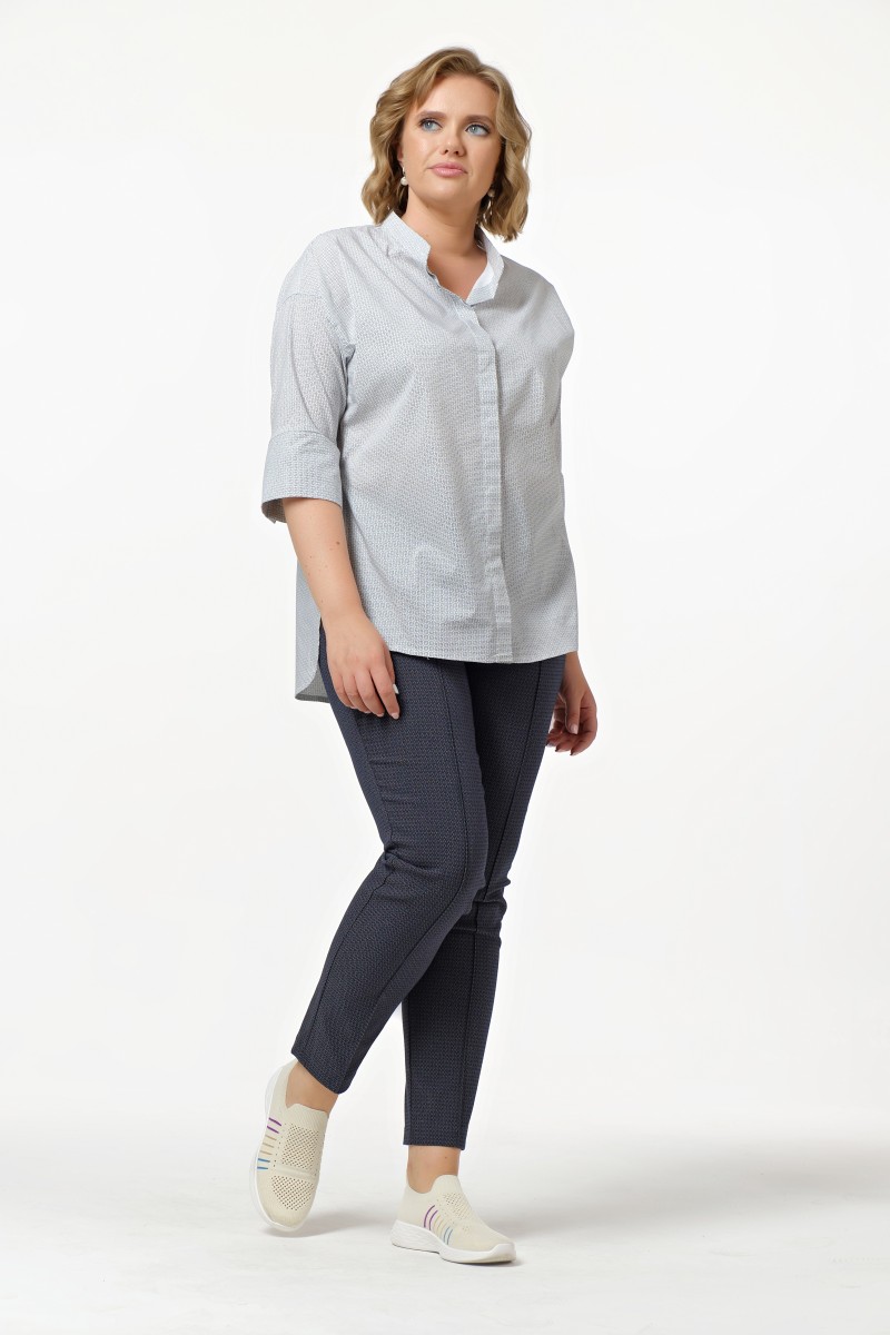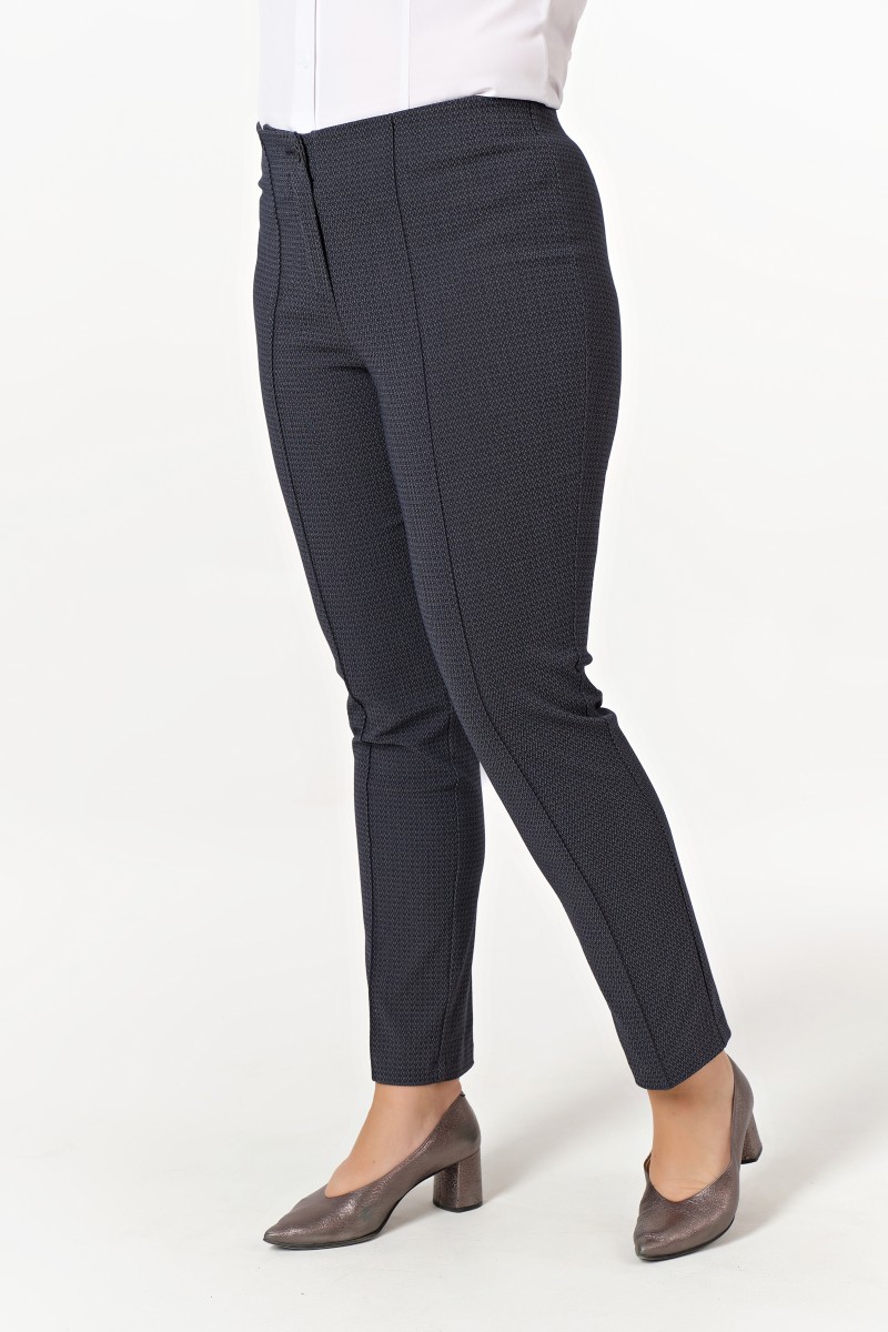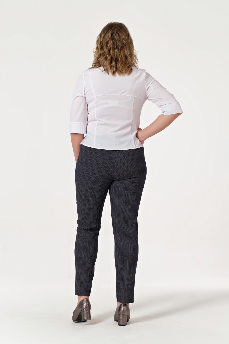 Брюки с высокой комфортной посадкой. В пояс брюк вложена резина создающая комфортное прилегание по линии талии. На переде брюк настроченные «стрелки». Застежка центральная на переде на «молнию» и 2 пуговицы