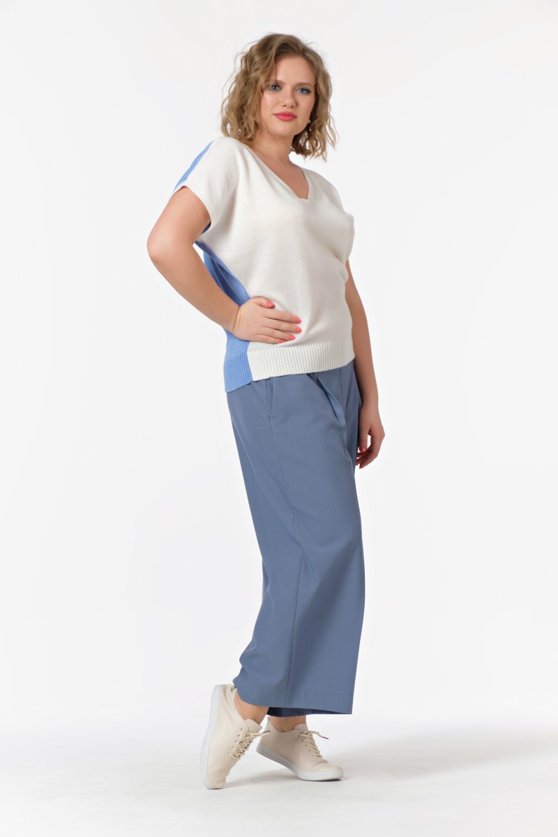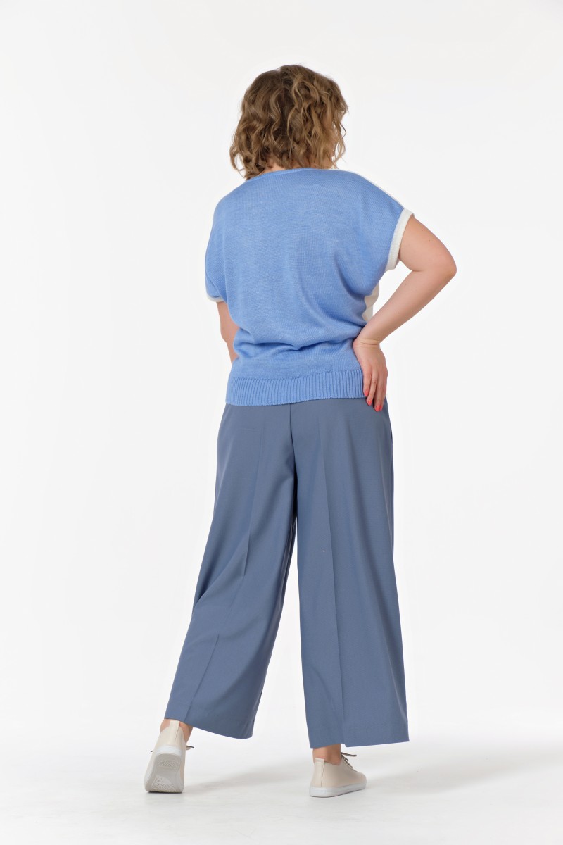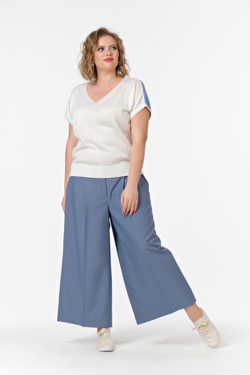 Широкие палаццо создадут эффектный силуэт и добавят образу элегантности. Их лучше сочетать с лаконичным верхом — приталенной блузкой или топом. Каблуки визуально удлинят ноги и сбалансируют объём широкого кроя.