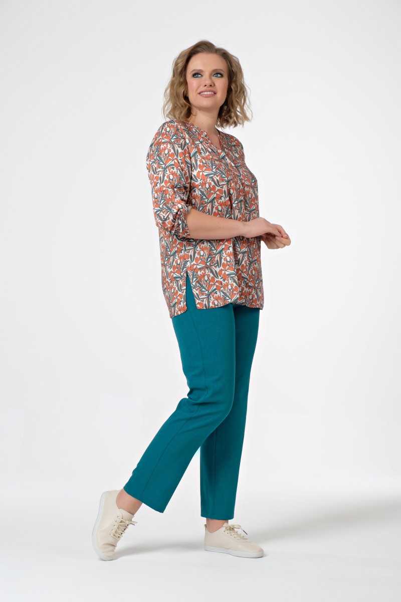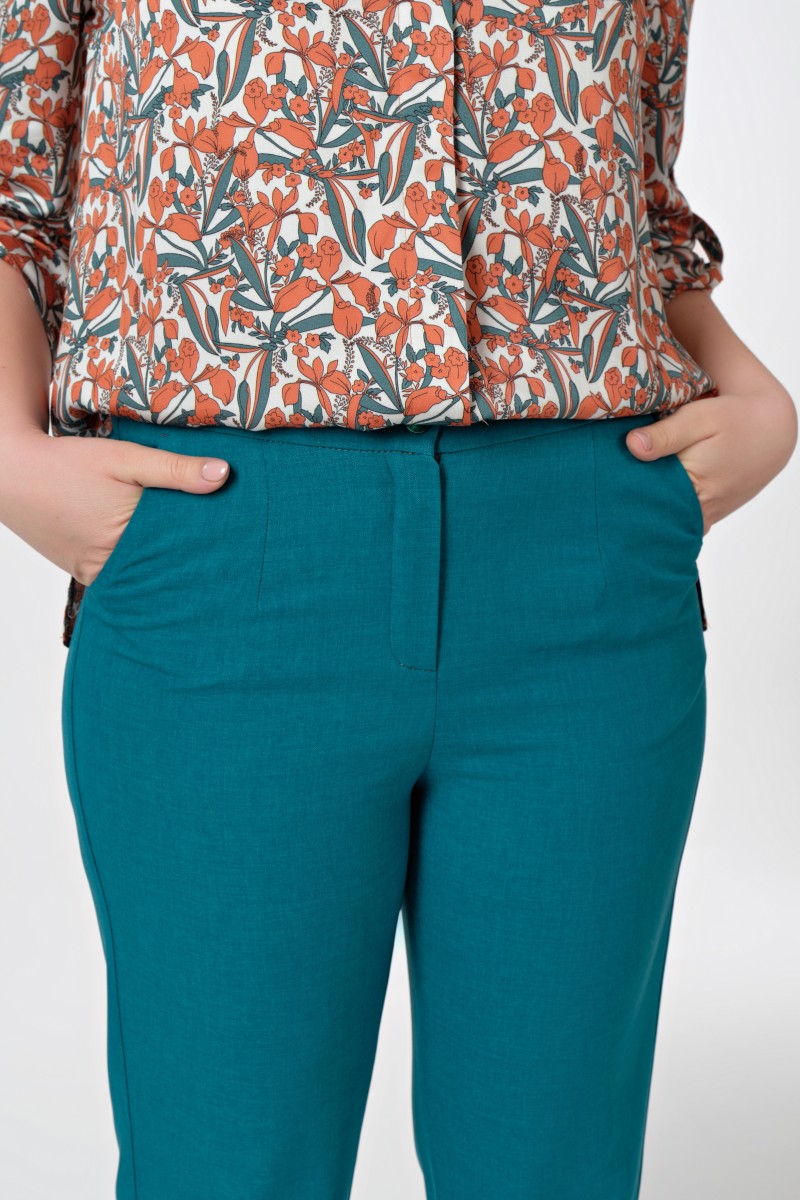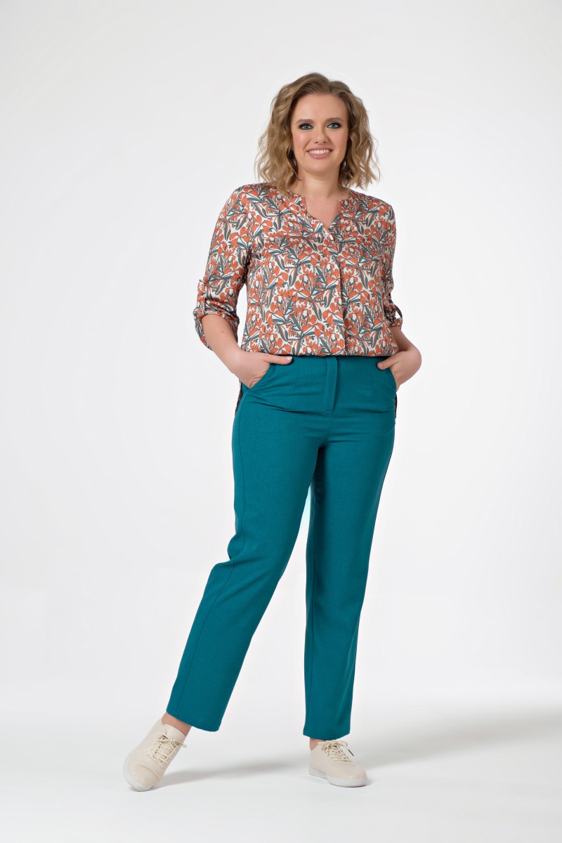 Брюки классические слегка зауженные к низу с лампасами на притачном поясе. В заднюю часть пояса вставлена эластичная резина обеспечивающая комфортное прилегание по талии. Центральная застежка на «молнию» и 1 пуговицу на поясе. На переде боковые карма