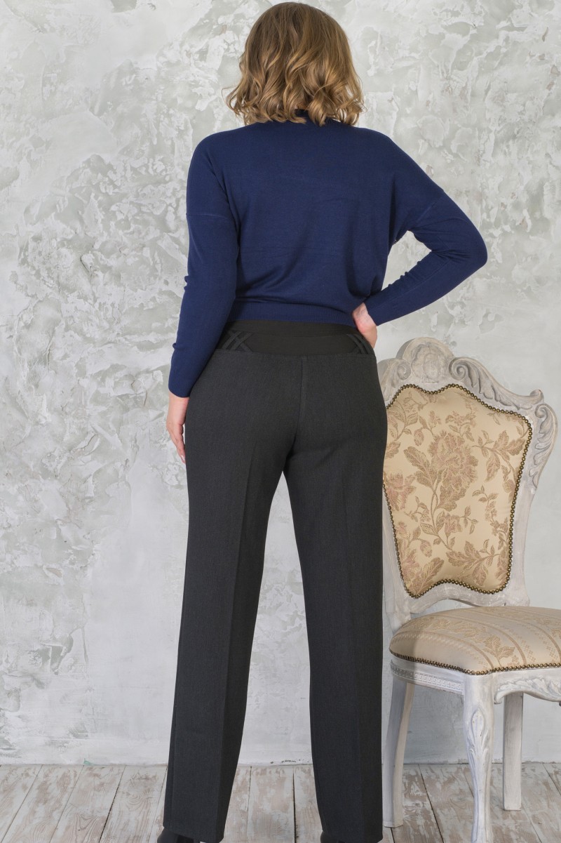 Брюки классические со «стрелками». Высокая комфортная посадка достигается за счёт эластичного трикотажного пояса-кокетки состоящего из двух частей. В нижнюю часть пояса крестообразно вставлены шлевки. Все детали пояса отстрочены на двухигольной машине. В