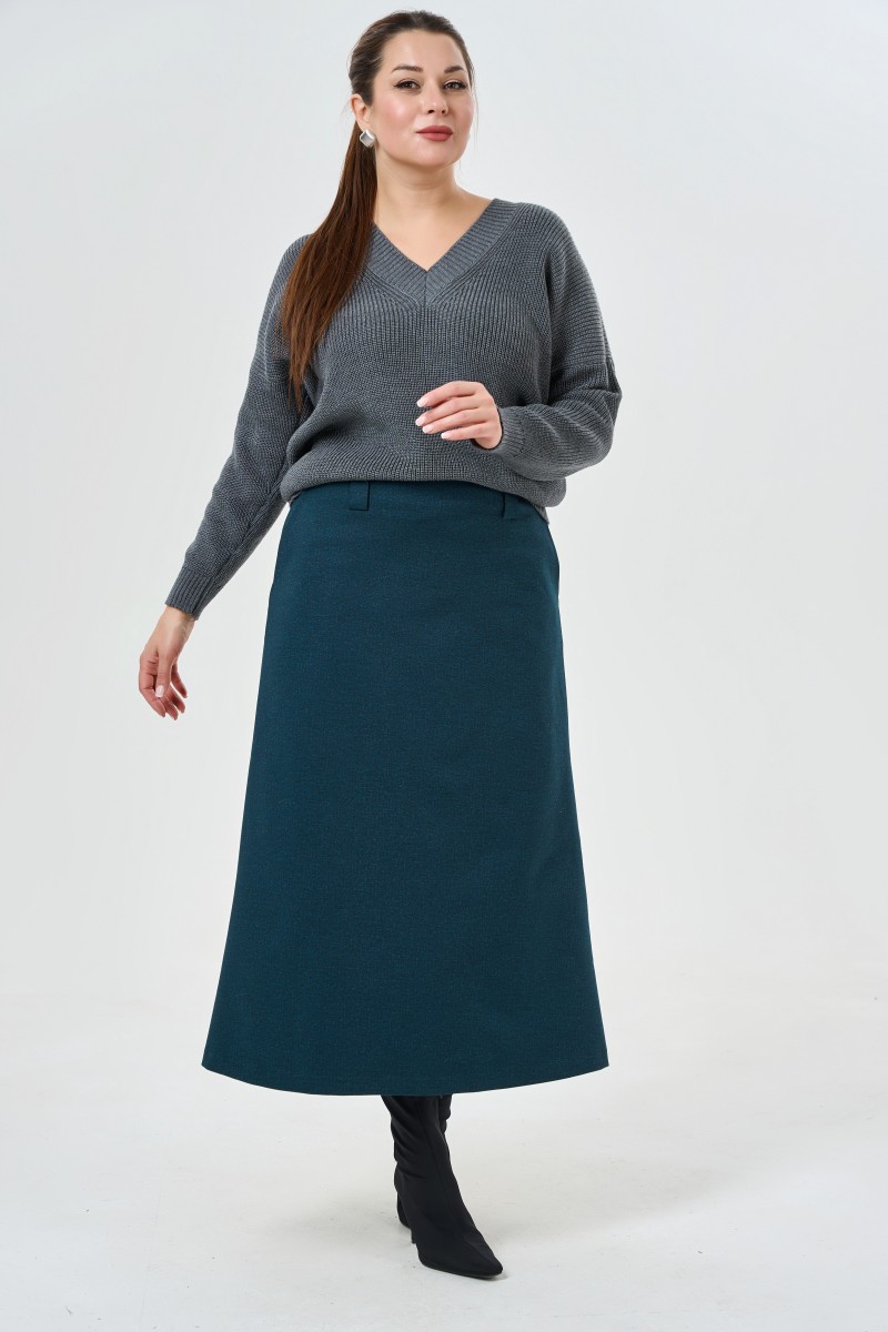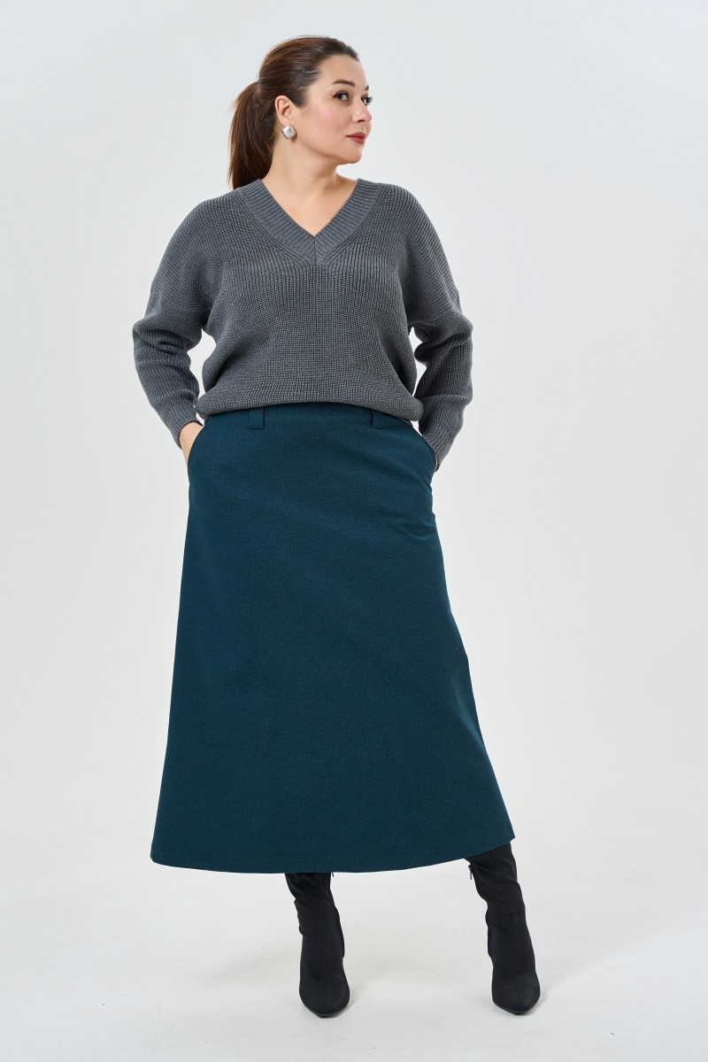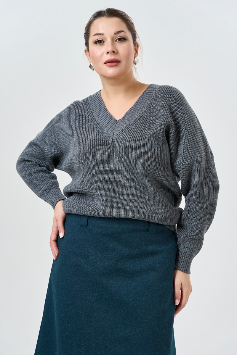 Обьемный вязаный женский джемпер прямого силуэта с V-образным вырезом горловины. Рукава спущенные полной длины.
