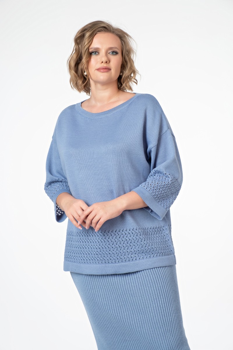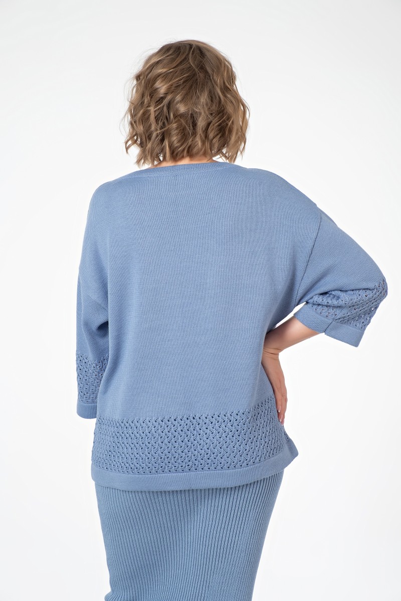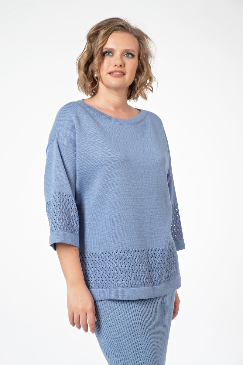 Джемпер женский вязанный (переплетение: кулирная гладь)/ прямого силуэта/ рукава длиной ¾ цельнокроеные с членением выше локтя/ с ажуром по низу рукава и по низу изделия вырез горловины «лодка» обработанный бейкой.