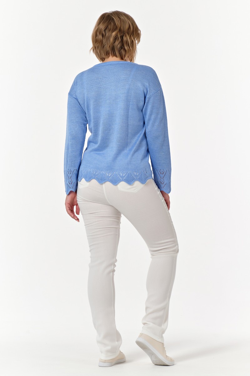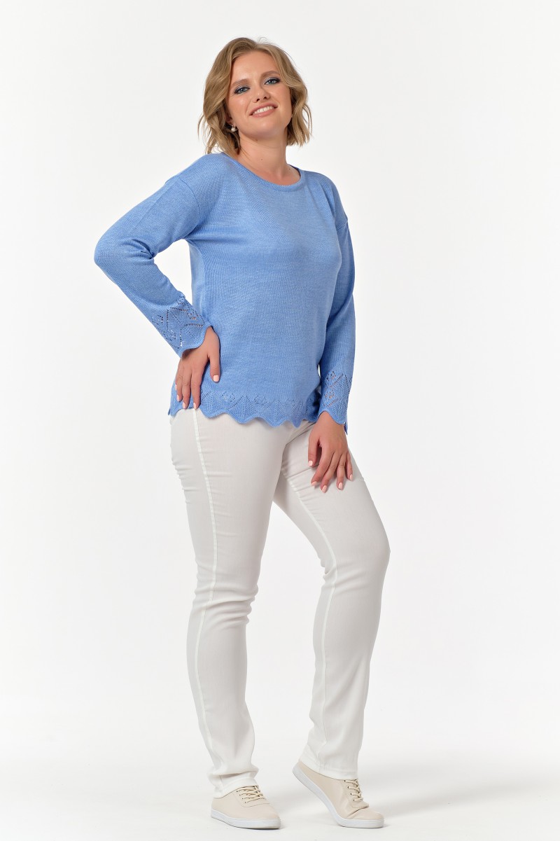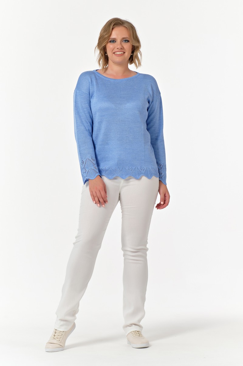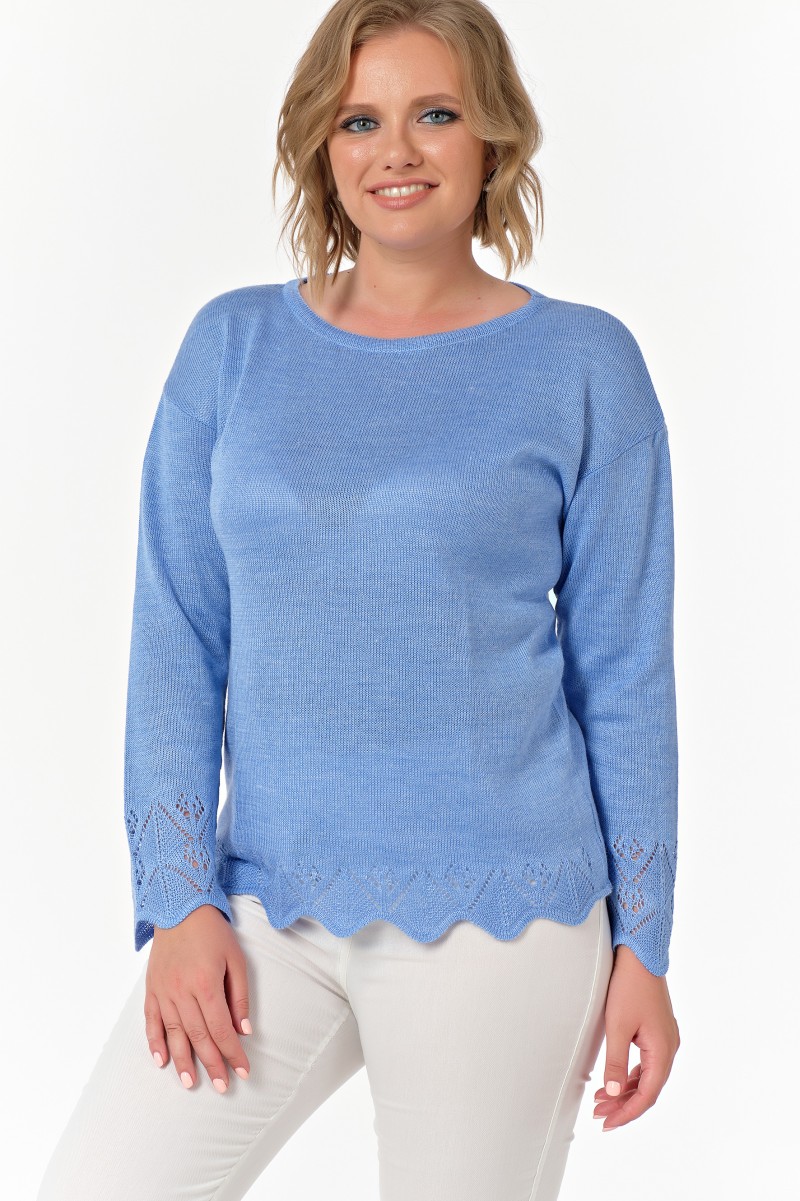 Джемпер женский вязанный (переплетение: кулирная гладь)/ прямого силуэта/ рукава длинные цельнокроеные с членением выше локтя/ с ажуром по низу рукава и по низу изделия круглый вырез горловины обработанный бейкой.