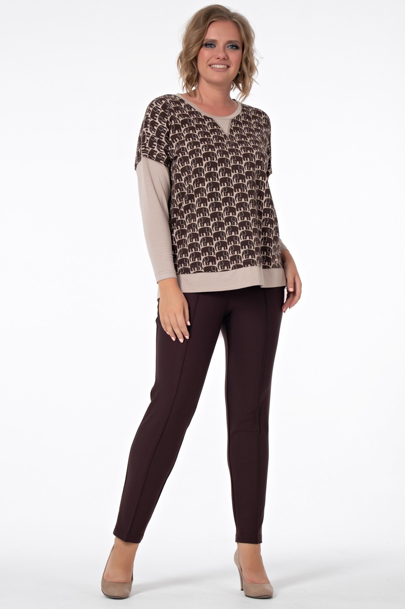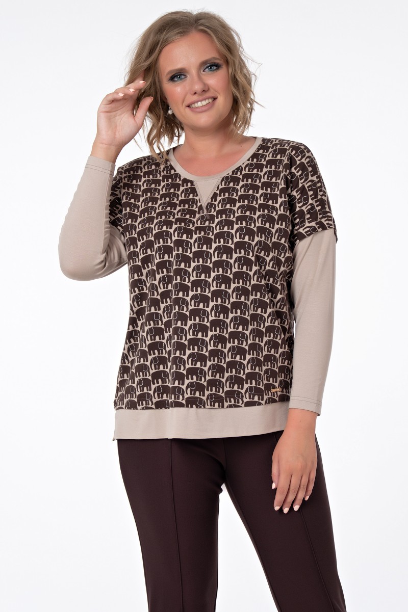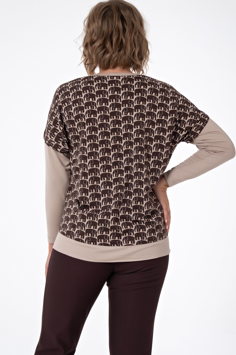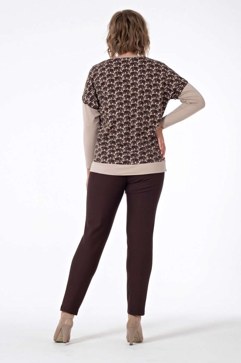 Джемпер женский прямого силуэта комбинированный. Рукава длинные цельнокроенные с членением выше локтя. Горловина круглая с отделочной деталью в форме треугольника обработана бейкой. По низу притачная широкая бейка с разрезами по бокам.