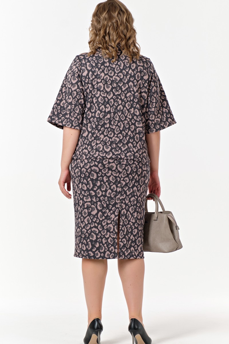 Костюм женский состоящий из джемпера и юбки. Джемпер – из плотного трикотажного полотна/ прямого силуэта/ длиной выше линии бёдер/ с разрезами в нижней части боковых швов/ с широкими втачными рукавами длиной 3/4/ с воротником стойкой./В верхней левой части