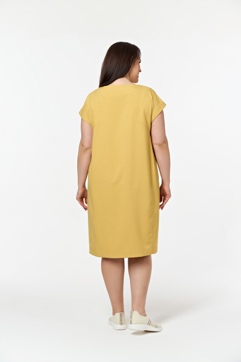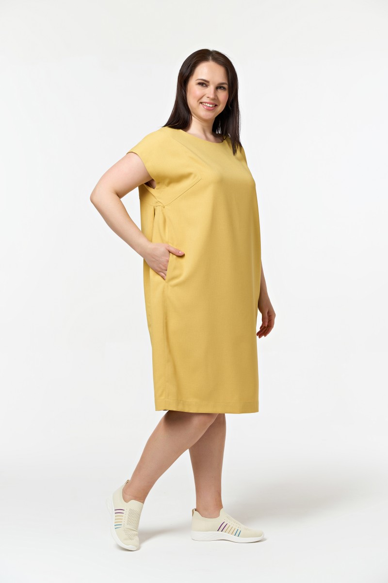 Платье женское прямого силуэта длиной ниже колена. Рукава спущенные. Горловина овальная. По спинке и переду фигурные кокетки. От кокеток идут вертикальные рельефы в которыхобработаны карманы.