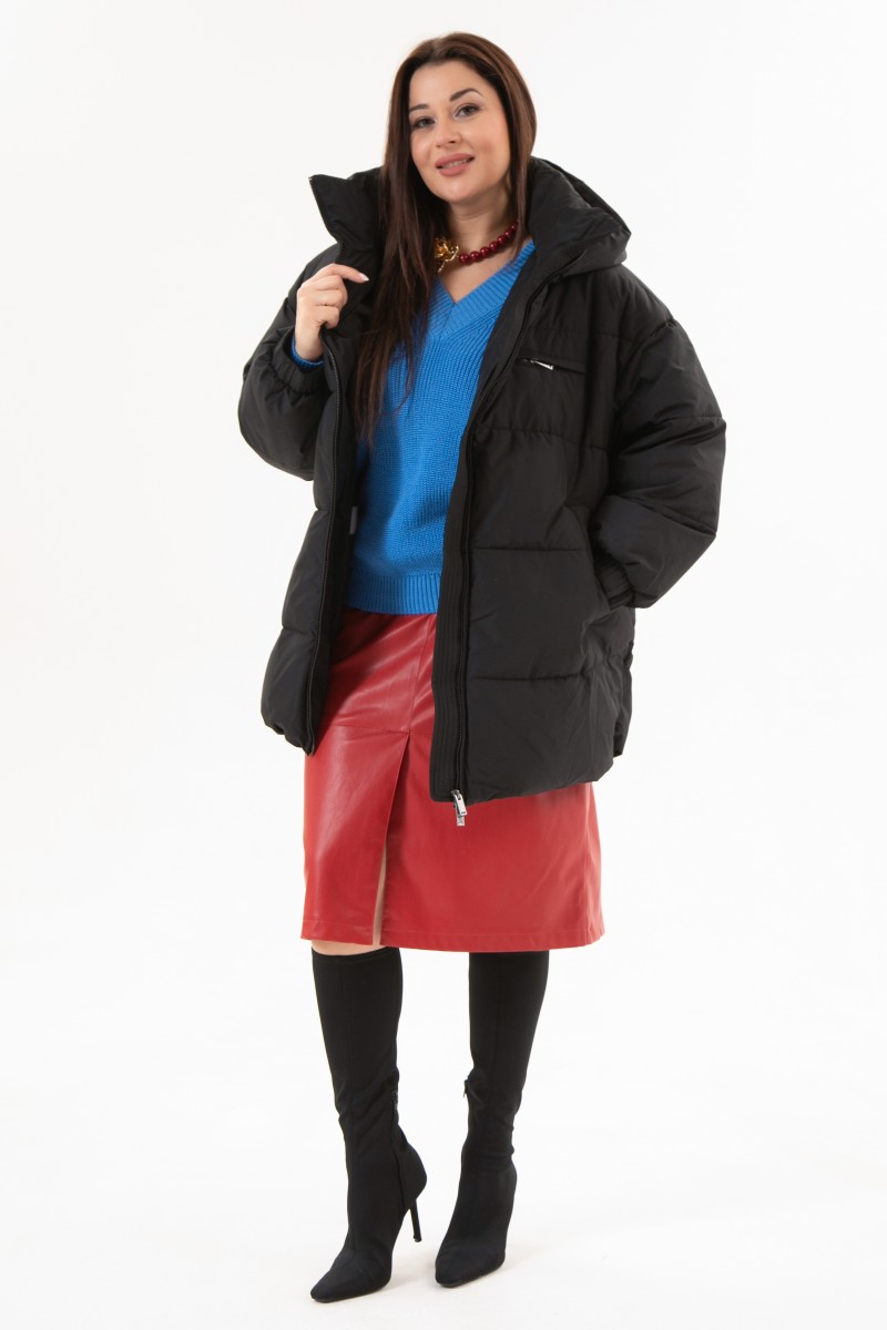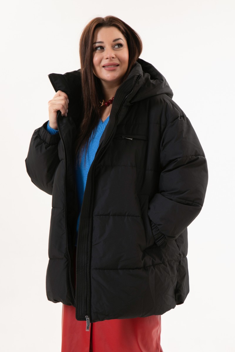 Женский пуховик прямого силуэта с отстегивающимся капюшоном в черном цвете.