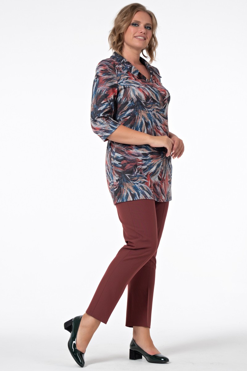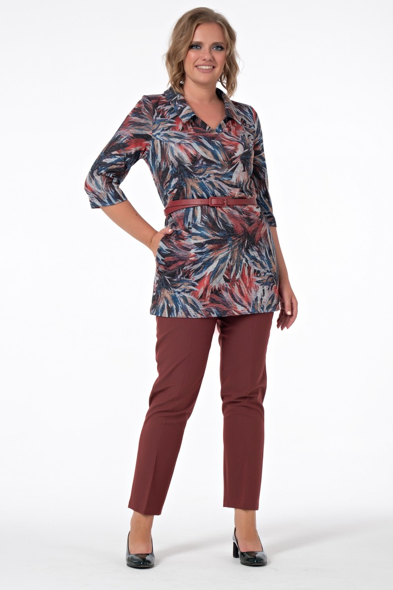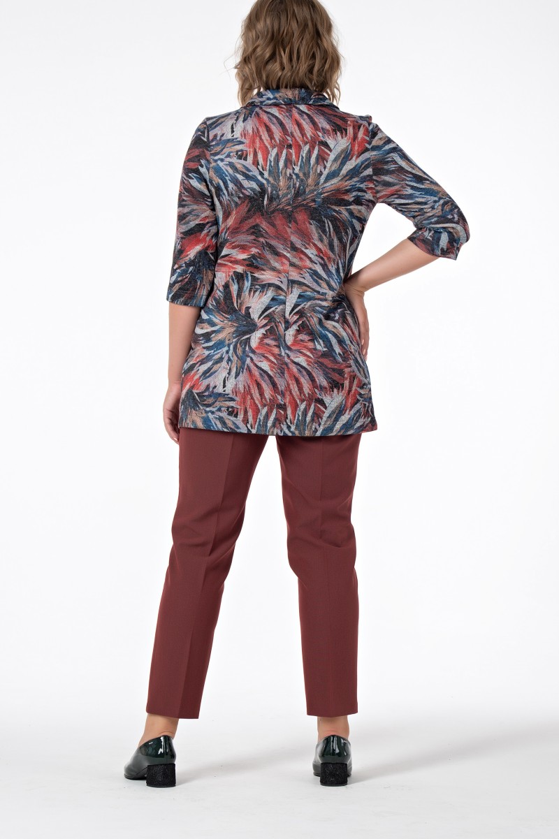 Туника силуэта «»»»трапеция»»»» с втачными длинными рукавами и круглой горловиной. Перед выполнен из двух тканей- трикотажа и креп шифон в цвет основной ткани. Низ изделия свободный двухслойный.