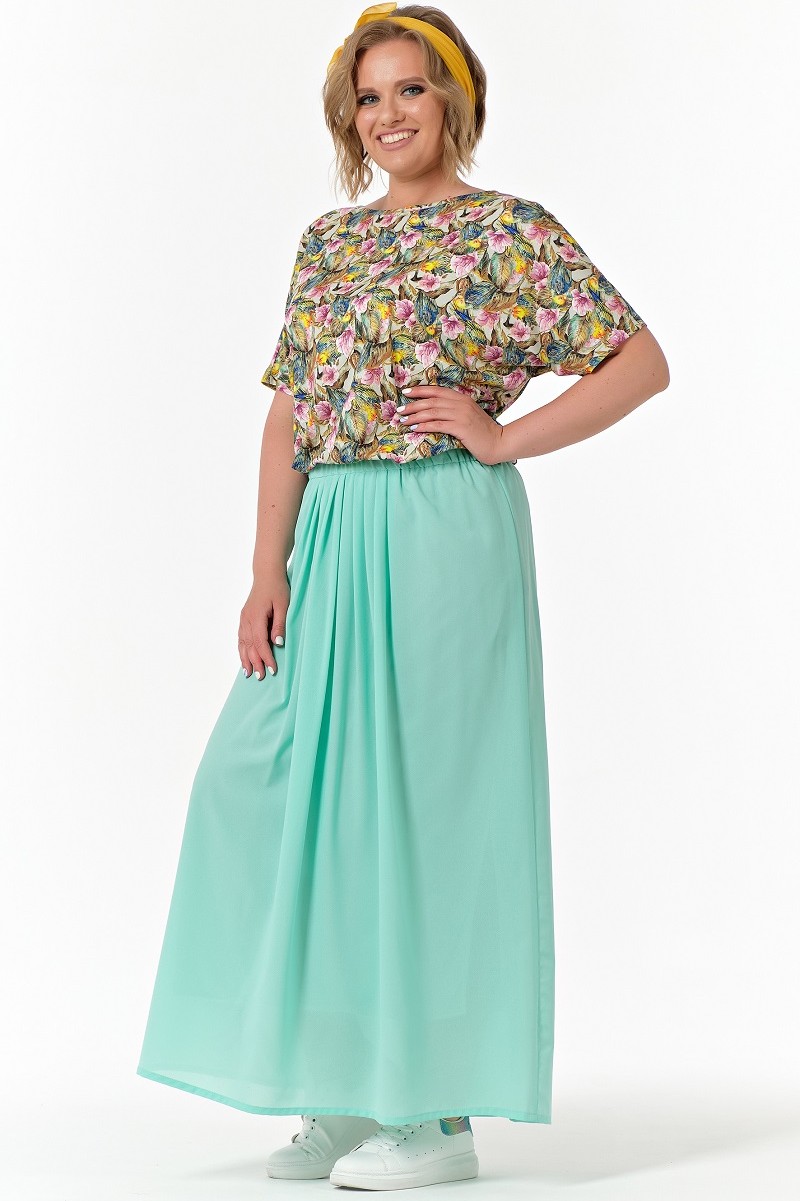 Юбка романтического стиля из легкой креповой ткани на подкладке длиной до щиколотки. Комфортное прилегание в области талии обеспечивается притачным поясом с вложенной резиной. Группы небольших складочек в центральной части переда и спинки создают расклеше