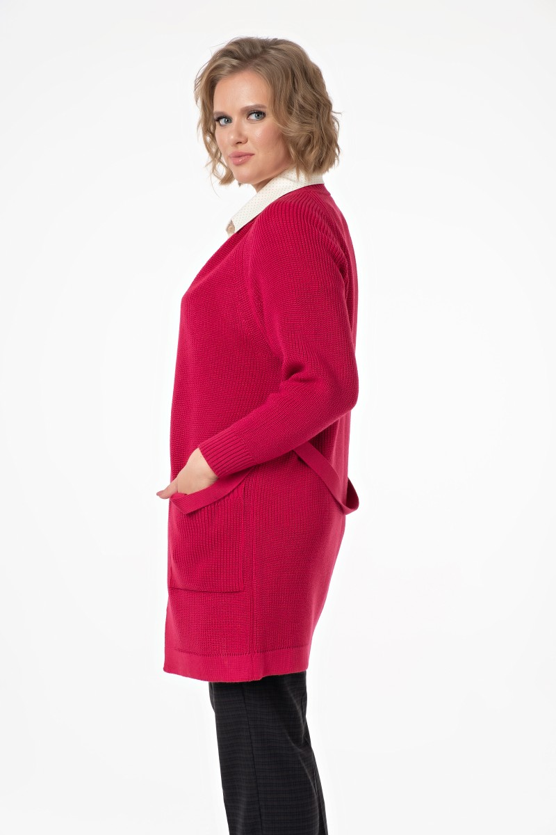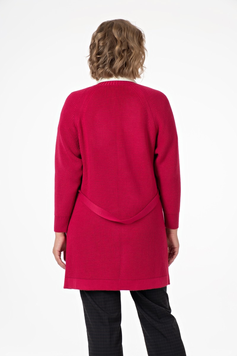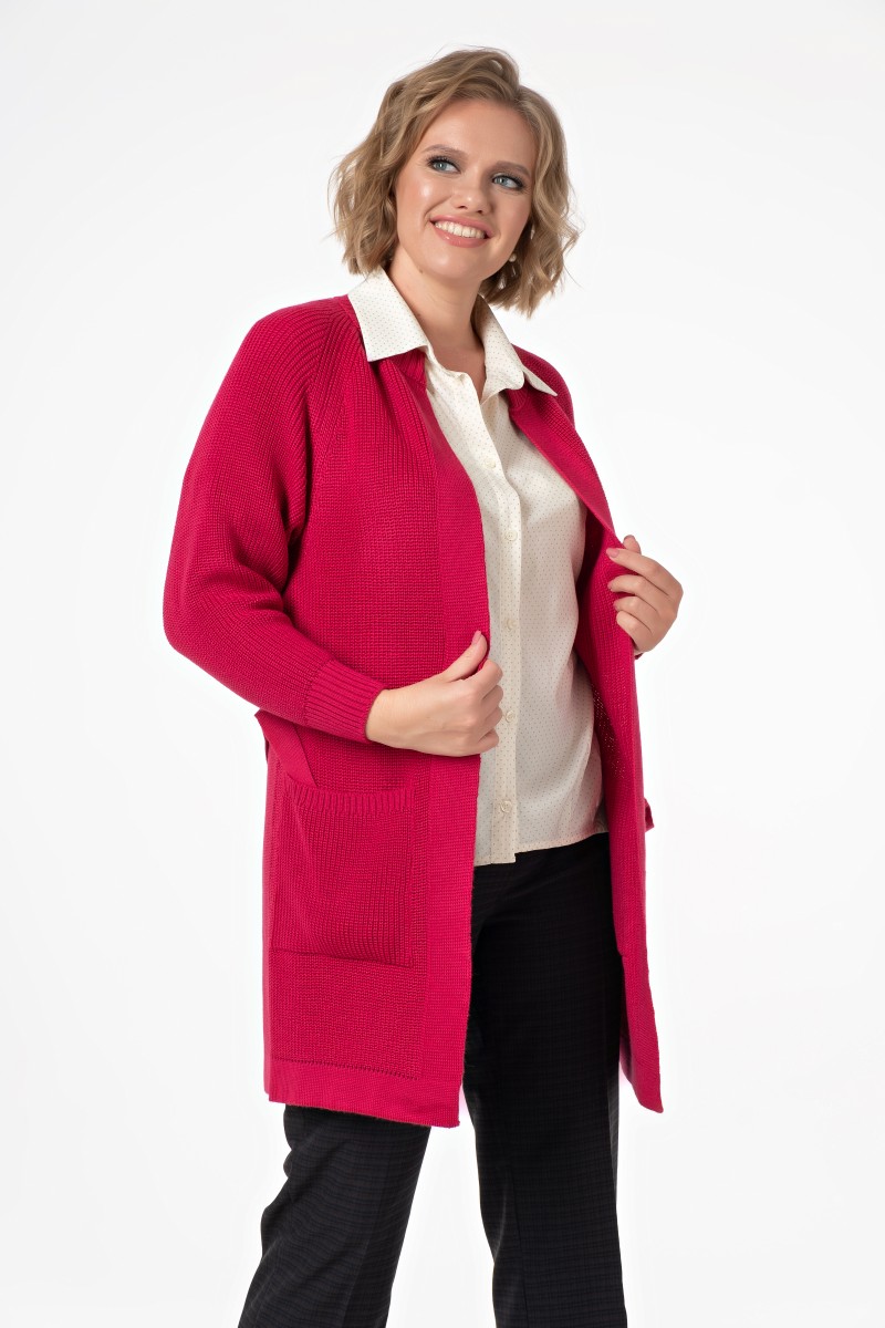 Жакет женский вязанный (переплетение: полуфанг)/ прямого силуэта длина до колена без застежки горловина с воротником — стойка. Рукав реглан длинный перед с накладными карманами. На боковых швах шлевки в который продет пояс.