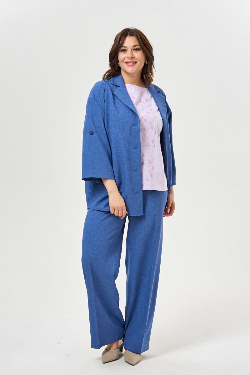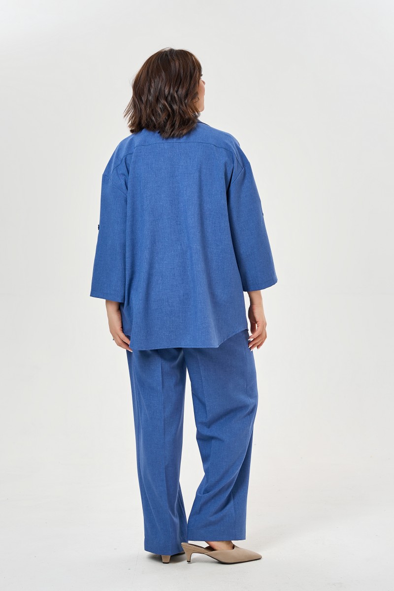 Жакет рубашечного кроя прямого силуэта. Воротник с лацканом пиджачного типа. Рукава рубашечные длиною 7/8 (собраны на пату). Кокетка со спинки переходит на перед. Застежка по переду центральная на 4 выметаных петли и пуговицы. Низ изделия фигурный.