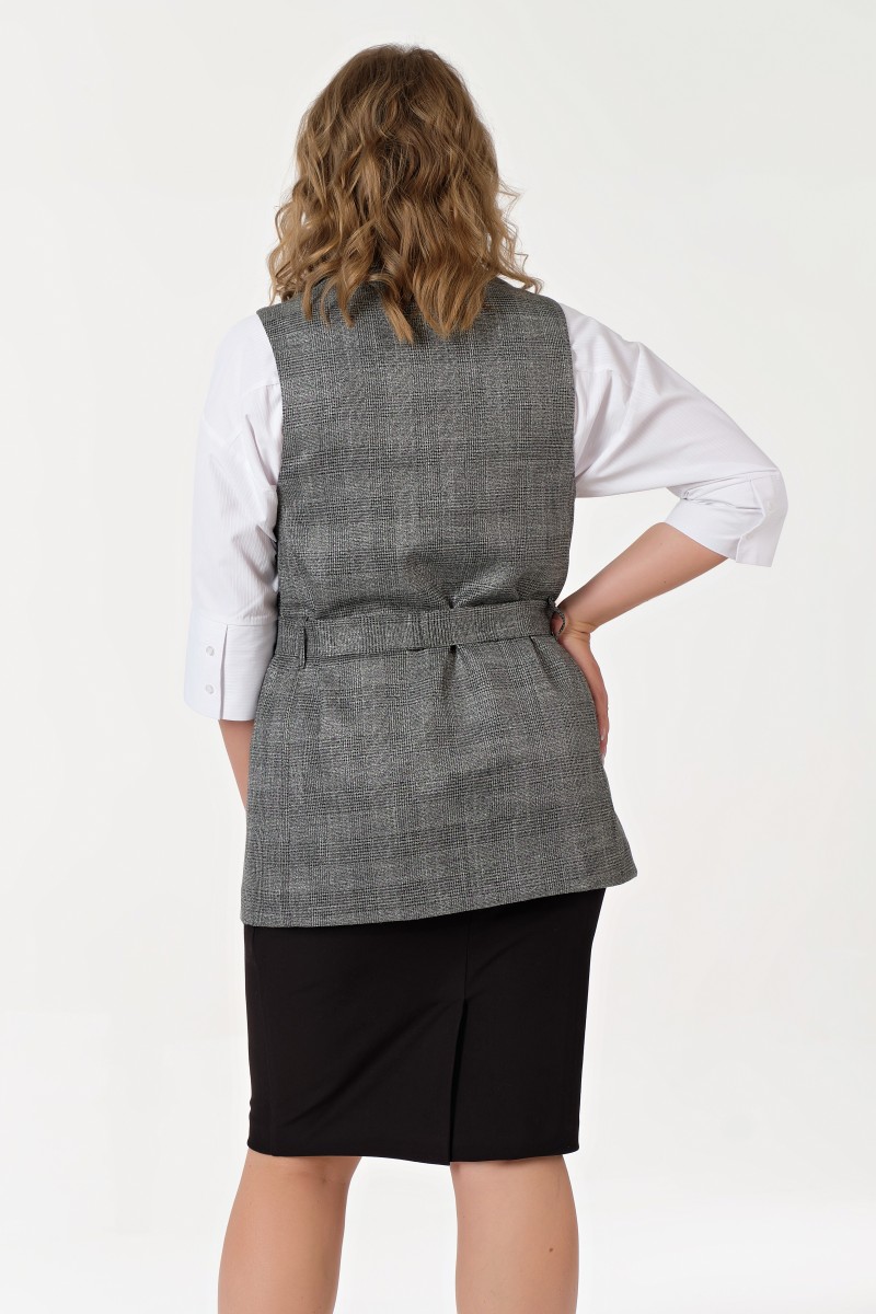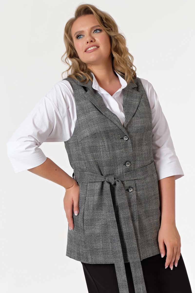 Жилет прямого силуэта с центральной застежкой на три петли-пуговицы и с воротником пиджачного типа. Без боковых швов с отрезным бочком.В шве переда выполнены карманы.Спинка без шва целая на внутренней обтачке. Подклад только по переду и бочкуотлетной по