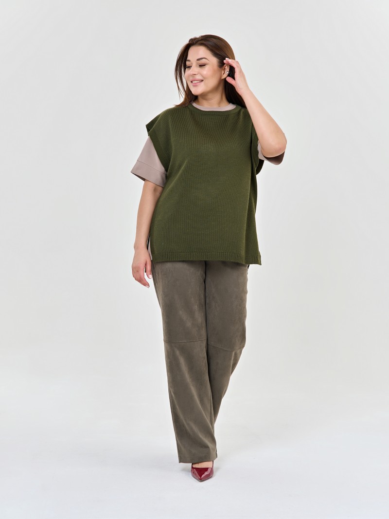 Жилет женский вязаный прямого силуэта с круглым вырезом горловины.Длина изделия ниже линии бедер спинка длинее на 3 см переда.