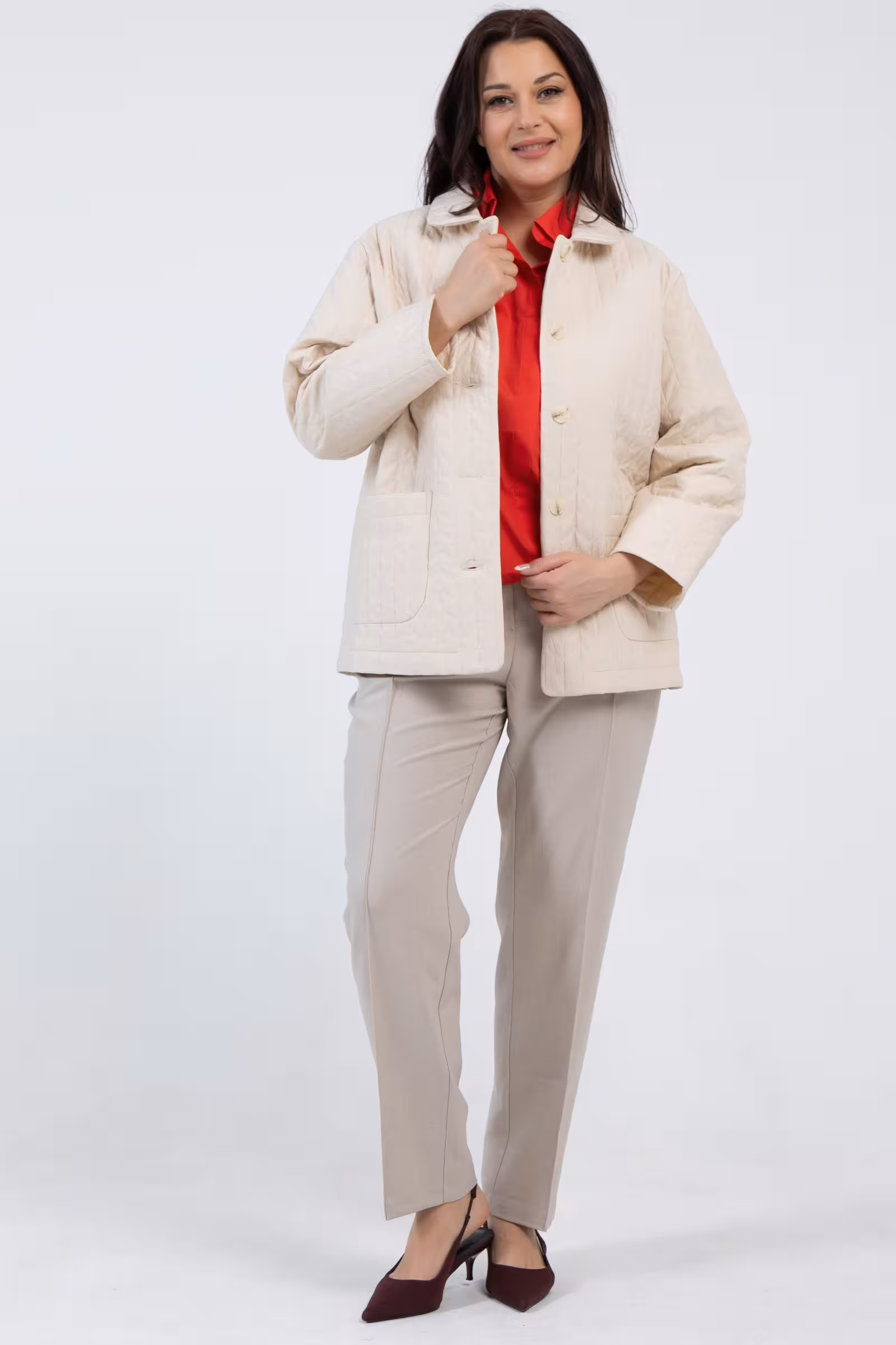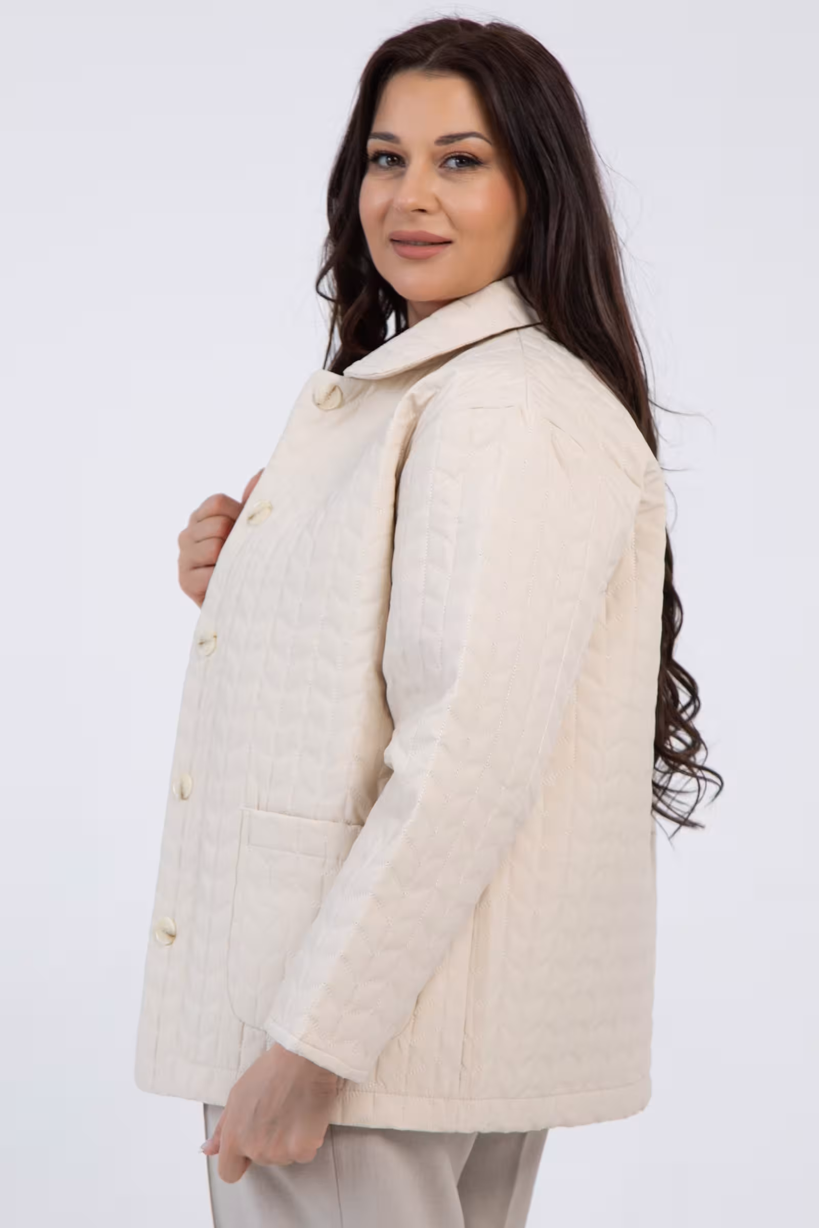 Демисезонная куртка с мягкими плечами и удобными накладными карманами дарит ощущение непринужденного стиля. Классическая застежка на пуговицы подчеркивает женственность и элегантность силуэта.
