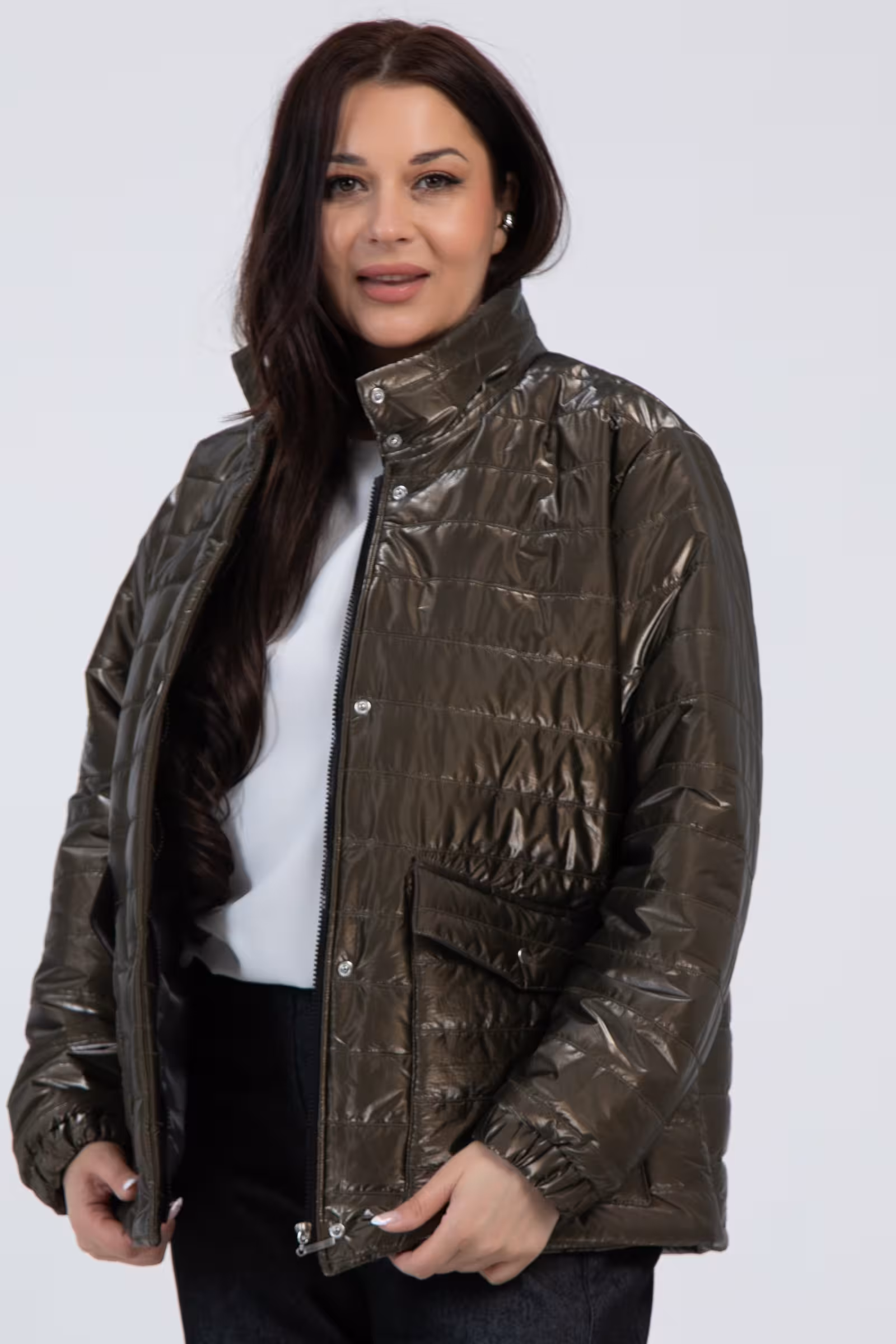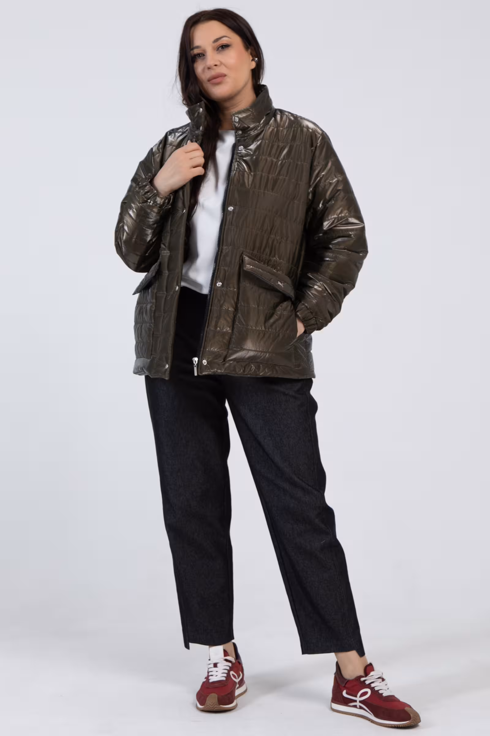 Куртка в оттенке хаки воплощает дух современного города и становится незаменимым спутником весенних дней. Свободный крой создает непринужденный стиль который легко адаптируется под разные жизненные ситуации. Высокий воротник-стойка защищает от прохладного ветра а двойная застежка на молнию и кнопки обеспечивает надежную защиту. Накладные карманы с клапанами не только добавляют функциональности но и создают характерный силуэт в стиле милитари.Длинные рукава с мягкими резинками по низу сохраняют тепло и создают современную спортивную эстетику. Легкая ткань делает куртку комфортной для активной городской жизни.Такая модель органично вписывается в casual-лук для прогулки по весеннему городу или встречи с друзьями. Она одинаково хорошо сочетается с джинсами и кроссовками для создания расслабленного образа или с брюками и ботинками для более структурированного urban-стиля. Оттенок хаки добавляет образу характер и подчеркивает современное понимание женственности через призму функциональности и стиля.