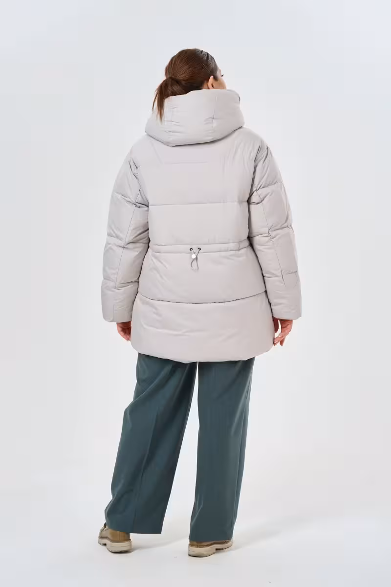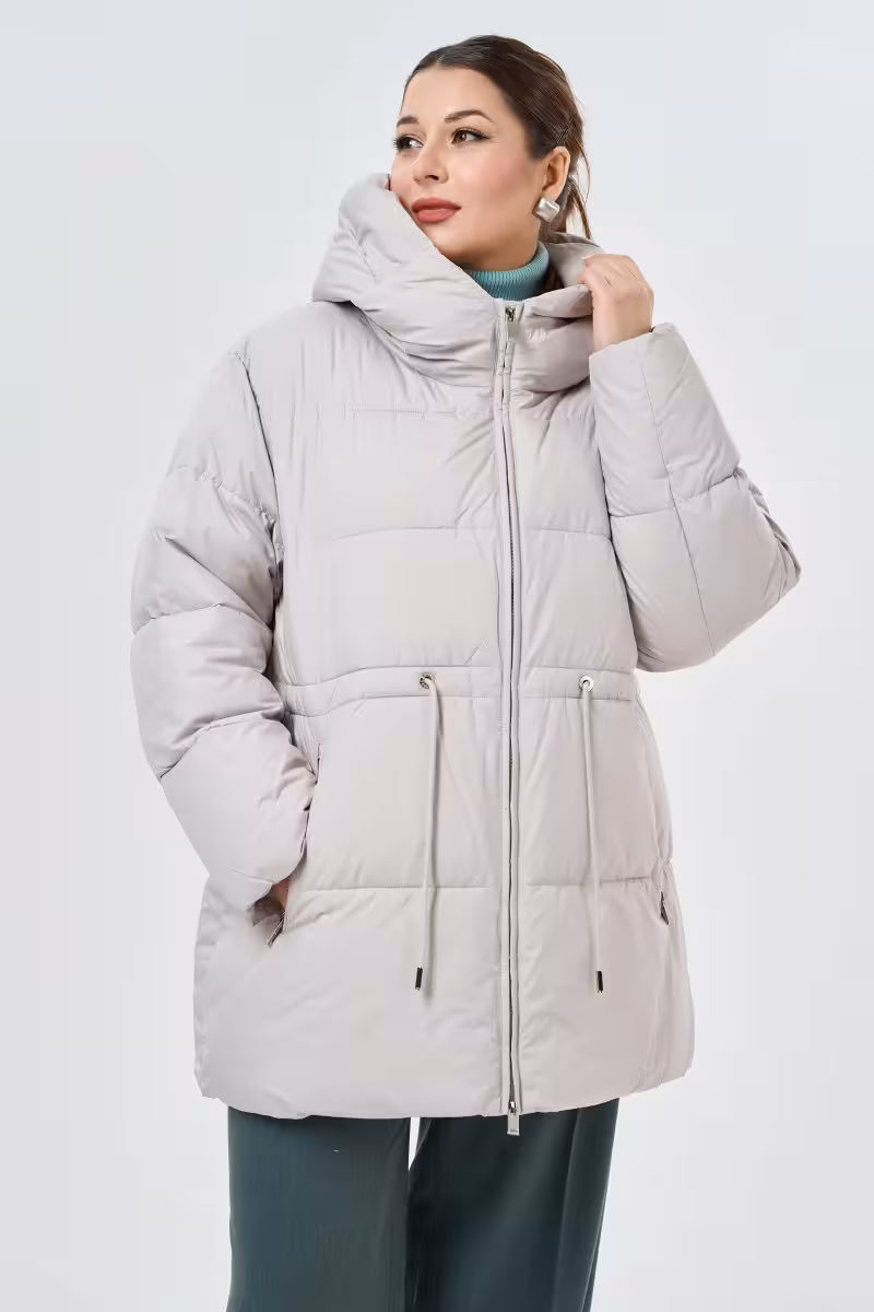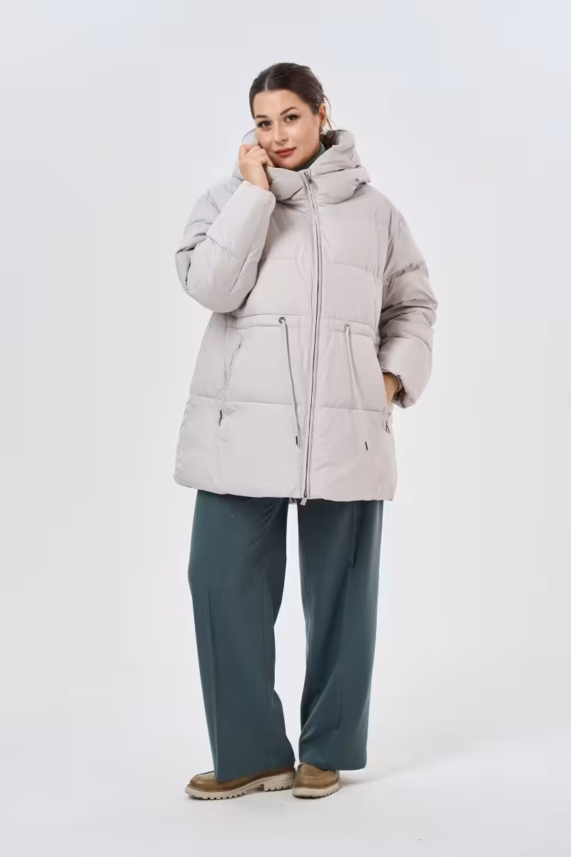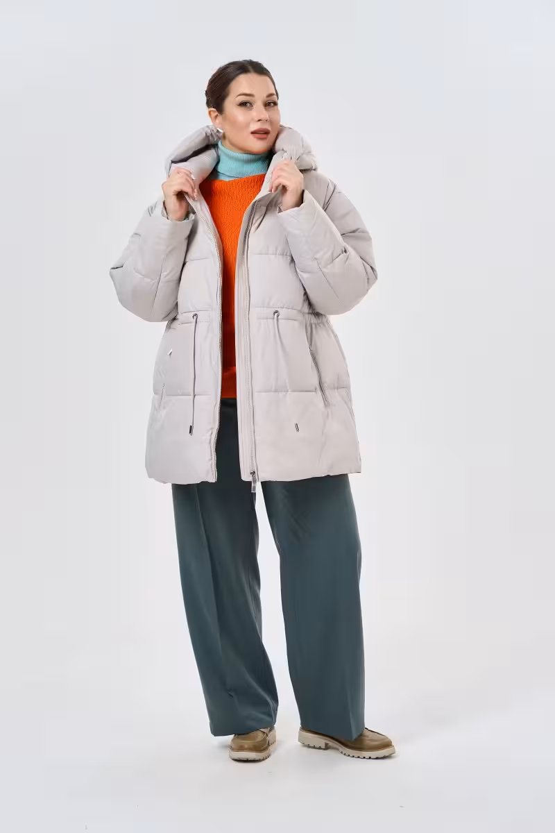 Современный пуховик в благородном бежевом цвете станет основой зимнего гардероба. Высокий воротник-стойка надежно защищает от ветра а объемный капюшон дополнительно укрывает в непогоду. Главная изюминка модели – регулируемый пояс на спине который позволяет создать более приталенный силуэт и подчеркнуть фигуру.Удобные карманы на молнии расположены по бокам – в них поместятся все необходимые мелочи. Рукава дополнены мягкими трикотажными резинками которые не пропускают холодный воздух и создают дополнительный комфорт. Основная молния проходит по всей длине изделия что делает процесс надевания максимально простым.Качественный утеплитель обеспечивает отличную терморегуляцию даже в сильные морозы. Этот пуховик прекрасно сочетается с зауженными брюками и высокими сапогами для прогулок по городу. Для делового образа можно выбрать прямые брюки и строгую обувь. Универсальный бежевый оттенок гармонично смотрится как с яркими аксессуарами так и в монохромных образах.