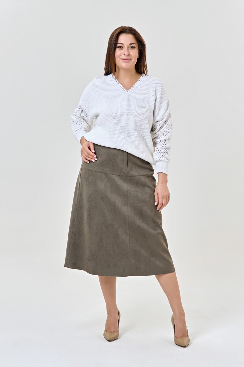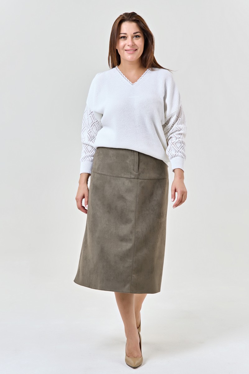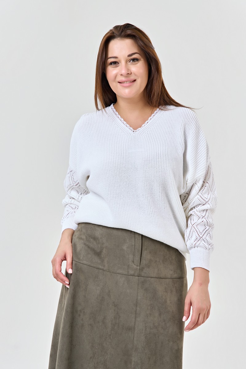 Вязаный женский джемпер из хлопка с V-образным вырезом горловины и ажурным рисунком на рукавах.