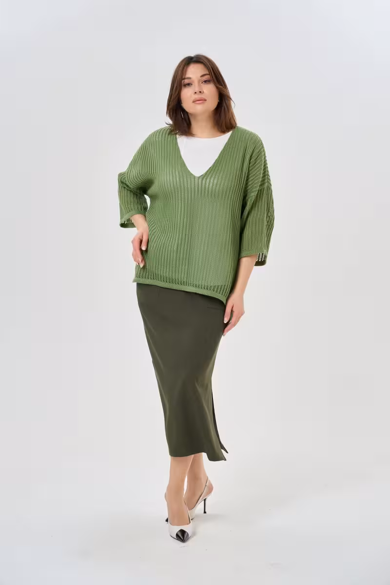 Зеленый джемпер с открытой сетчатой вязкой — это история про комфорт без компромиссов в стиле. V-образный вырез создает элегантную линию декольте а воздушная фактура добавляет образу легкости. Рукава длиной три четверти — практичная деталь для межсезонья и офисного дресс-кода.Натуральный хлопок в составе обеспечивает дыхание кожи и приятные тактильные ощущения. Сетчатая вязка играет светом и тенями создавая интересную текстуру. Такой джемпер становится основой для многослойных образов — носите его поверх белой футболки или тонкого топа.В паре с прямыми брюками высокой посадки получается стильный деловой лук для офиса или встречи. Зауженные джинсы и этот джемпер — формула для прогулки или casual пятницы. Юбка-миди и такая модель создают женственный образ для вечернего выхода.Универсальный зеленый оттенок легко сочетается с базовыми цветами гардероба. Джемпер подходит для путешествий благодаря комфортному крою и практичной длине рукавов.