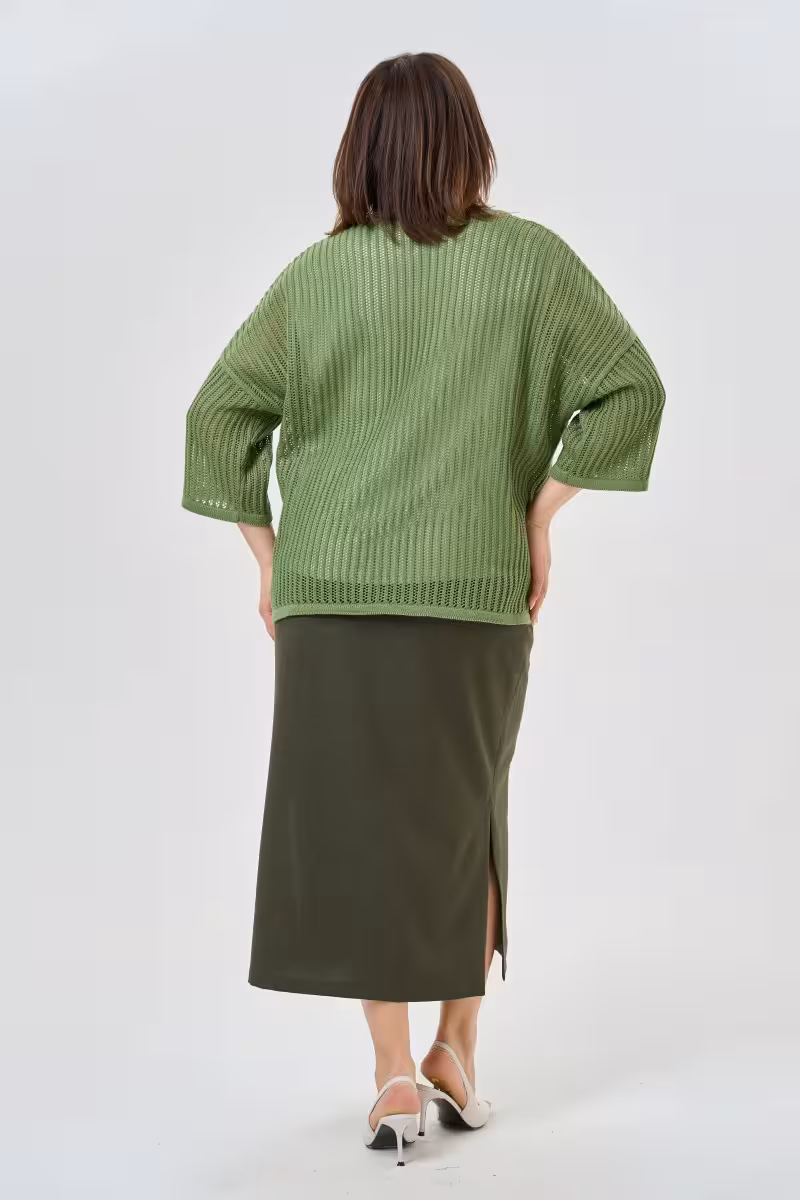 Воздушная сетчатая вязка создает эффект легкости и непринужденности. V-образный вырез добавляет женственности повседневному образу. Рукава три четверти подчеркивают изящество силуэта.