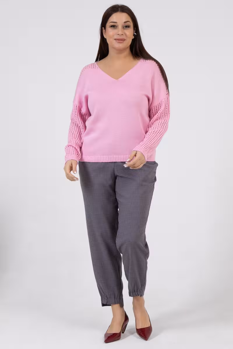Романтика в каждой детали — так можно описать этот изящный джемпер нежно-розового оттенка. V-образный вырез создает элегантную линию декольте визуально удлиняя шею и подчеркивая женственность. Особый шарм модели придают ажурные узоры которые начинаются на плечах и плавно переходят на рукава полной длины.Натуральный хлопок делает джемпер не только красивым но и практичным — он дышит сохраняет форму и приятен к телу. Свободный крой не сковывает движений позволяя чувствовать себя комфортно в любой ситуации.Этот джемпер станет основой для создания множества образов. С юбкой-карандаш он превратится в элегантный деловой образ для офиса. В паре с широкими брюками создаст непринужденный casual-лук для прогулки или дружеской встречи. А с изящной юбкой миди подойдет для романтического свидания или особого случая.Нежный розовый цвет освежает лицо и добавляет образу мягкости. Ажурные детали играют светом создавая интересные визуальные эффекты. Завершённый образ получается без лишних усилий — достаточно добави