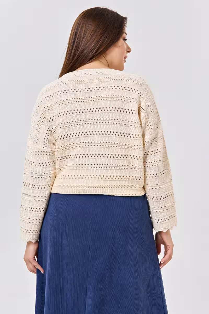 Этот ажурный джемпер превращает обычный день в особенный момент. Натуральный оттенок и изящный узор создают атмосферу легкости и романтики. Ворот лодочкой открывает линию плеч добавляя образу французского шарма.