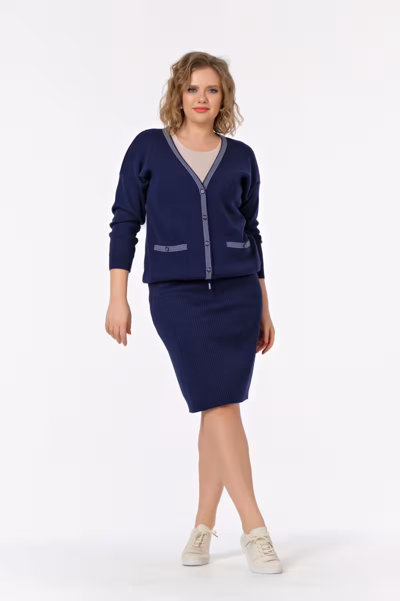 Вязаный жакет в благородном синем цвете – это история про современную элегантность без лишней торжественности. Прямой силуэт создает четкую линию плеч и подчеркивает естественные пропорции фигуры. V-образный вырез удлиняет шею и открывает возможности для экспериментов с аксессуарами и украшениями.Пять пуговиц по центру позволяют регулировать степень открытости образа – от строгого делового до более расслабленного casual. Накладные карманы добавляют практичности и создают интересные акценты в дизайне. Длина до линии бедер универсальна для большинства типов фигур.Мягкий трикотаж делает жакет комфортным спутником для долгого дня в офисе или деловой встречи. Он отлично сочетается с прямыми брюками и блузкой для создания делового образа. Для прогулок можно комбинировать с зауженными брюками и футболкой – получается современный городской стиль.Этот жакет легко адаптируется под разные occasions: офисные будни встречи с друзьями путешествия. Качественный состав ткани обеспечивает долговечность и сохранение фо