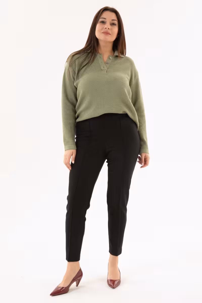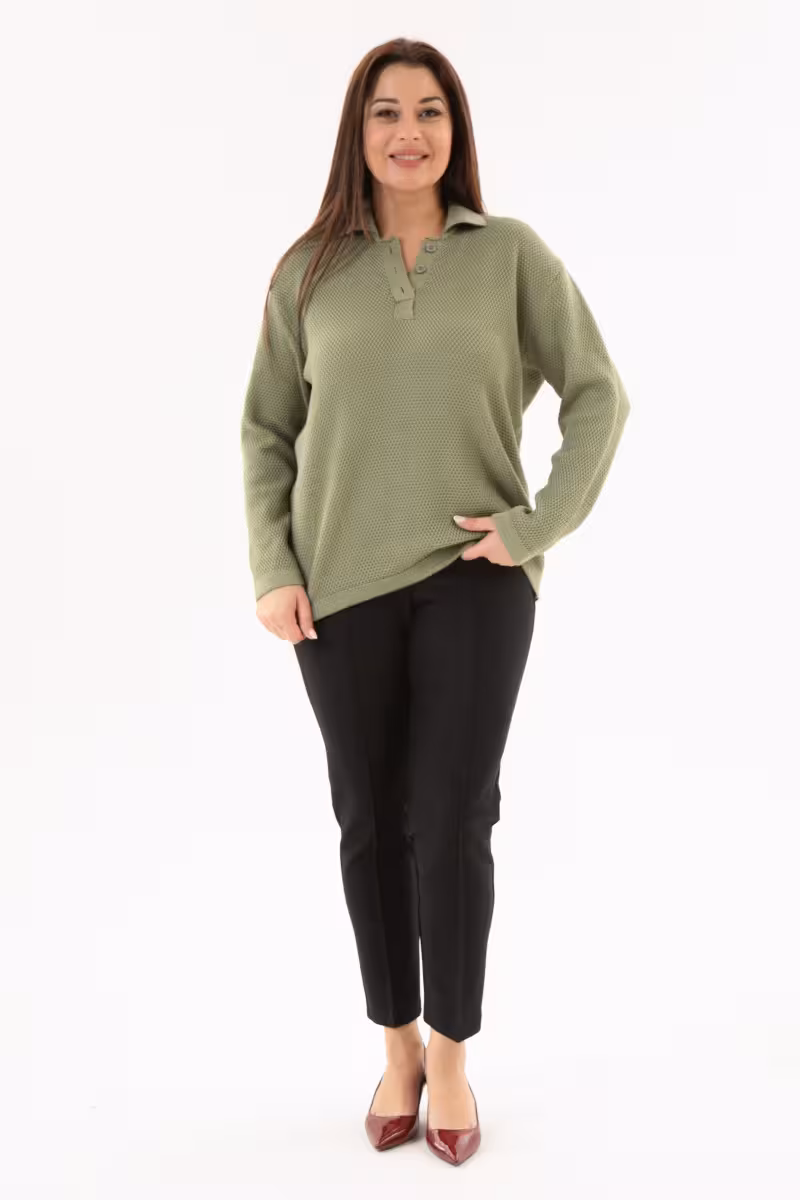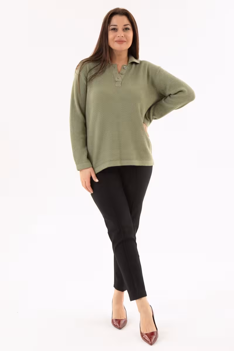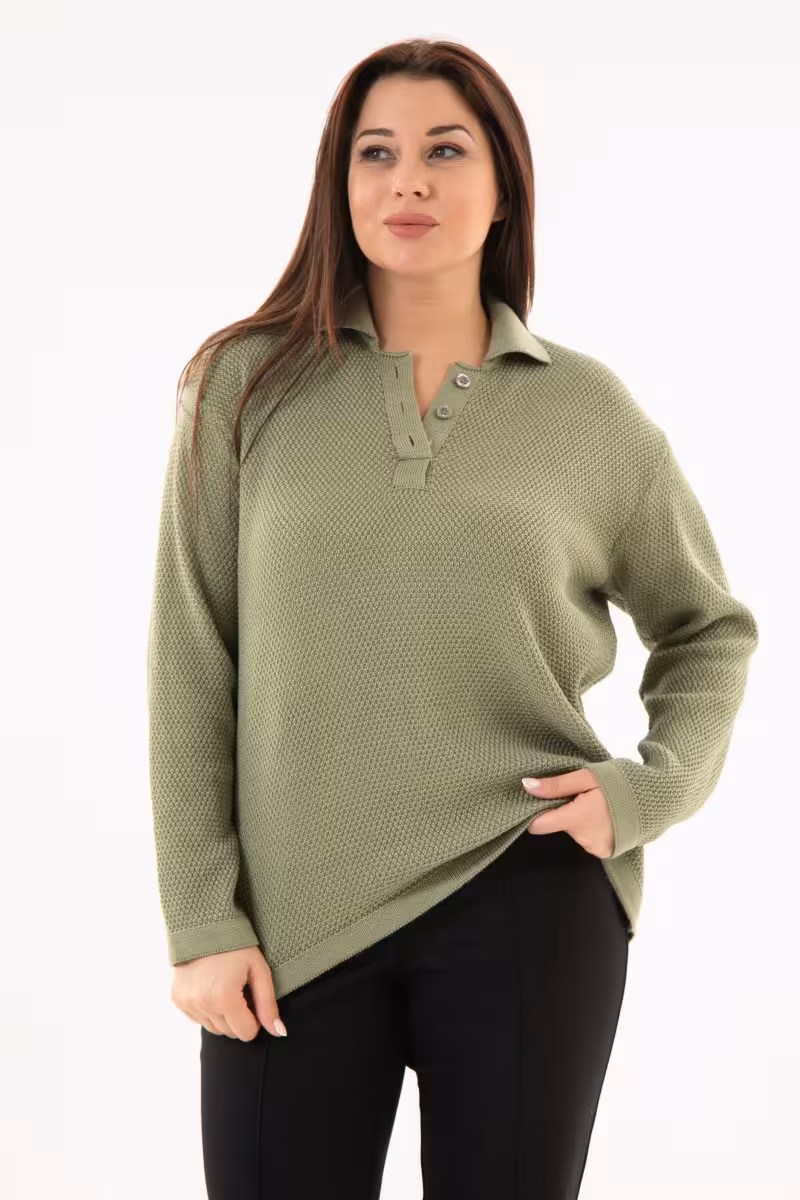 Этот джемпер в оттенке зеленого чая станет основой для множества образов. Воротник поло с застежкой на пуговицы позволяет играть с декольте – можно носить застегнутым до верха для строгого офисного лука или расстегнуть пару пуговиц для более расслабленного настроения. Длинные рукава и свободный крой создают комфорт в движении а мягкий трикотаж приятно прилегает к теле. Фактурный узор добавляет глубины однотонному цвету и делает джемпер самодостаточным элементом гардероба.В офисе он отлично сочетается с прямыми деловыми брюками и классическими туфлями. На выходных можно создать casual образ с зауженными джинсами и кроссовками. Для вечерней прогулки подойдут брюки-бананы свободного кроя.Натуральные волокна в составе обеспечивают воздухопроницаемость и долговечность изделия. Это тот случай когда простота формы компенсируется качеством исполнения и универсальностью применения. Джемпер одинаково уместен на деловой встрече и в путешествии.