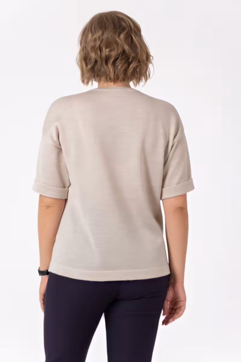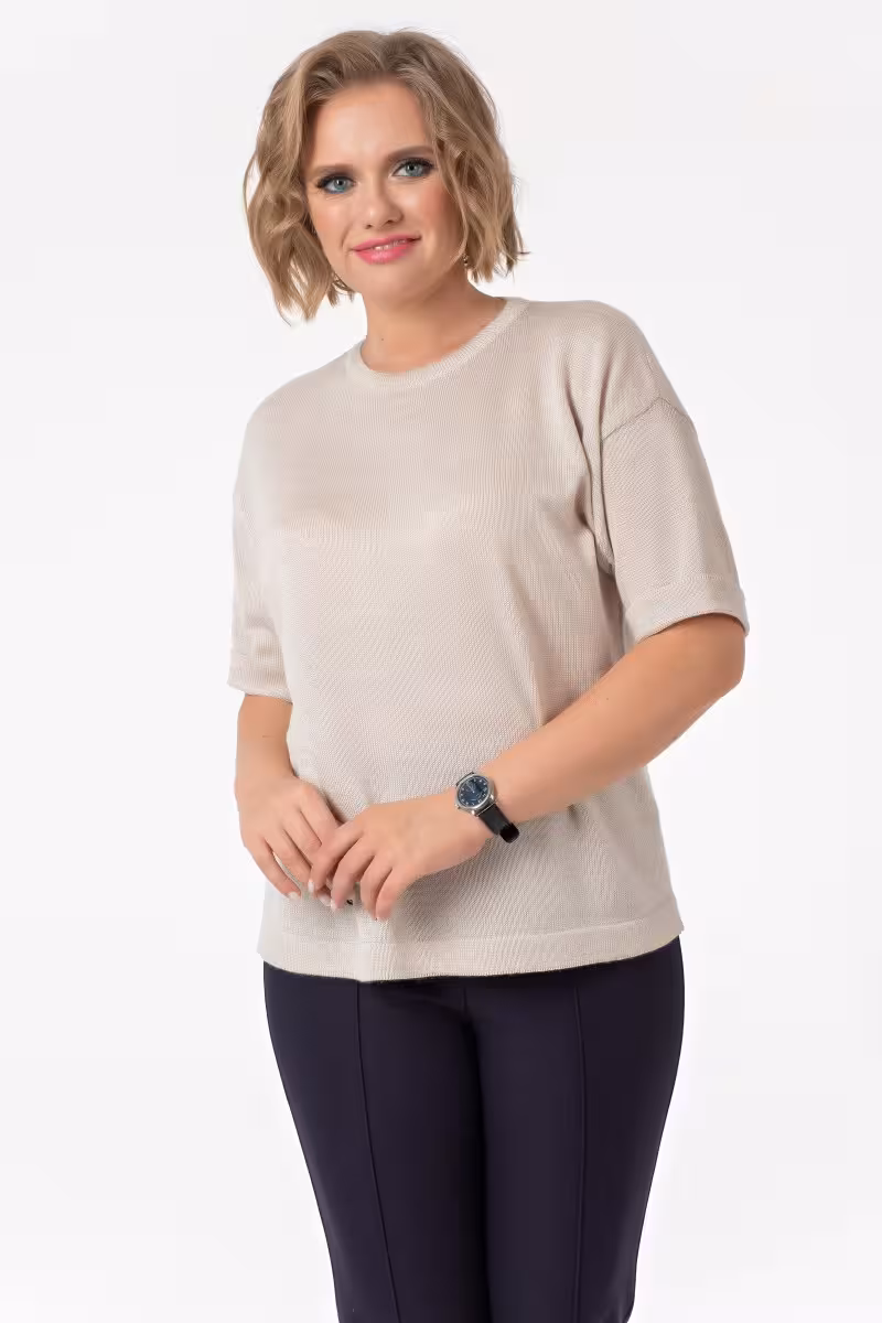 Мягкий джемпер нейтрального бежевого оттенка становится основой гардероба на межсезонье. Прямой силуэт создает непринужденную элегантность а рукава три четверти добавляют изысканности образу.