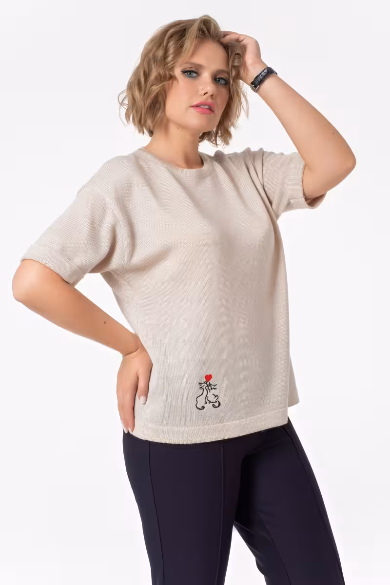 Этот джемпер воплощает философию спокойной элегантности – когда не нужно кричать о стиле достаточно просто его иметь. Бежевый оттенок работает как идеальный нейтральный фон для любых экспериментов с цветом и фактурами. Прямой силуэт не сковывает движения и подходит разным типам фигуры создавая непринужденную женственность без лишней театральности.Рукава три четверти с аккуратными отворотами – это классический прием который визуально удлиняет руки и добавляет образу особую утонченность. Круглый вырез горловины смягчает линии лица а деликатная вышивка справа становится тонким акцентом не перегружающим общую композицию.Мягкая вязаная фактура создает приятные тактильные ощущения и дарит комфорт в течение всего дня. Джемпер органично впишется в деловой образ с прямыми брюками и жакетом станет основой для casual-лука с зауженными джинсами или создаст элегантную базу для вечернего выхода в сочетании с юбкой. Универсальность этой модели позволяет носить ее в офисе на деловых встречах прогулках или в путеш