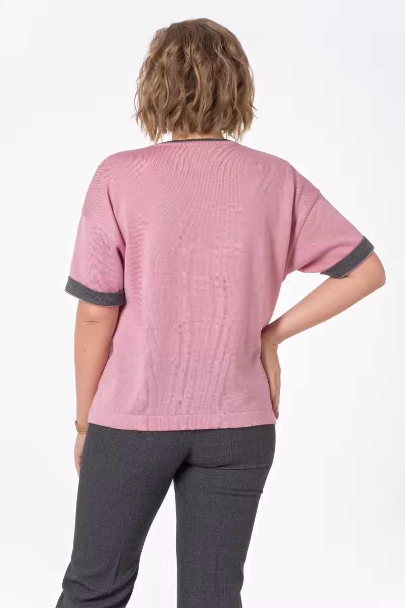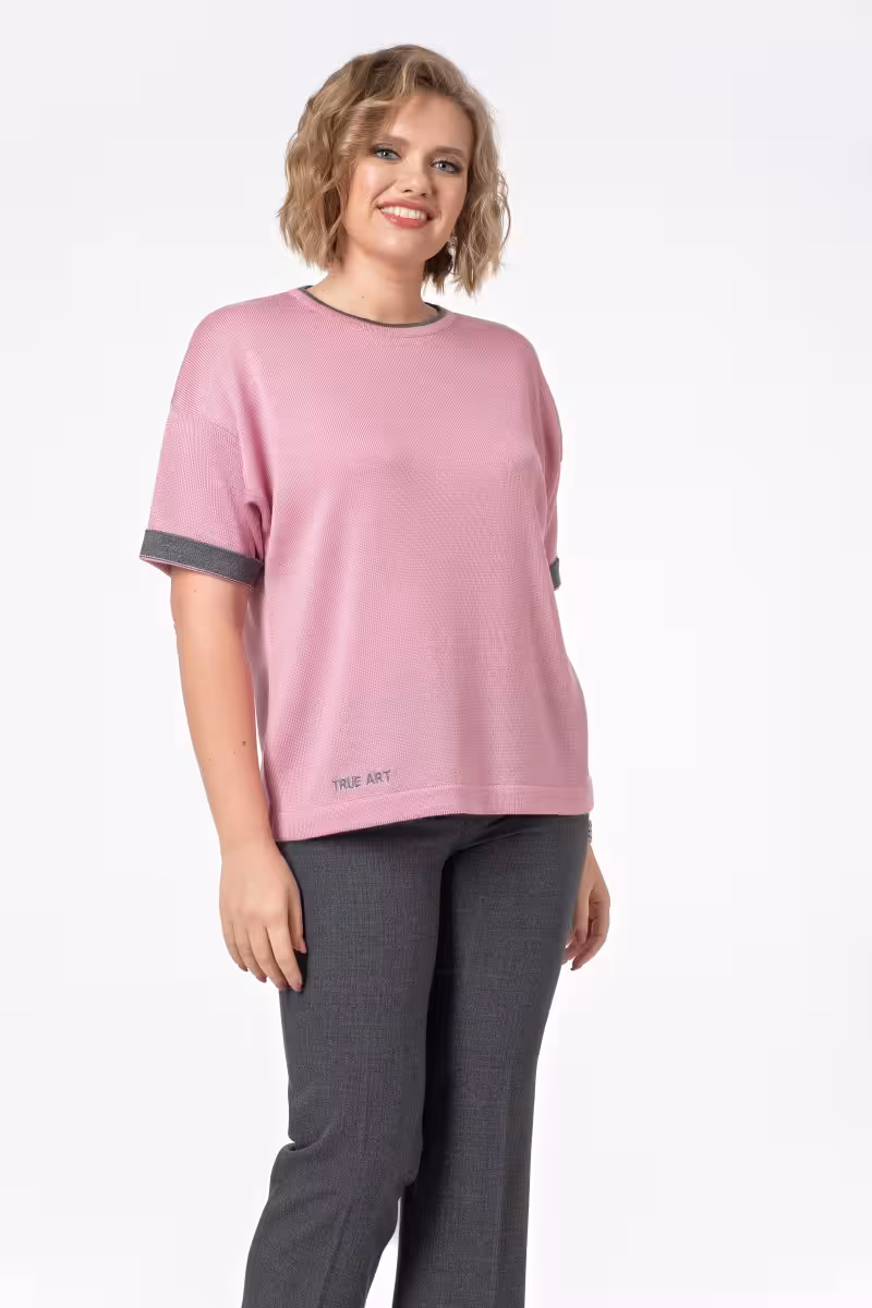 Мягкий трикотаж обволакивает силуэт создавая ощущение домашнего уюта даже в городской суете. Контрастная окантовка добавляет графичности романтичному розовому оттенку. Свободный крой со спущенной линией плеча дарит свободу движений и непринужденность образа.