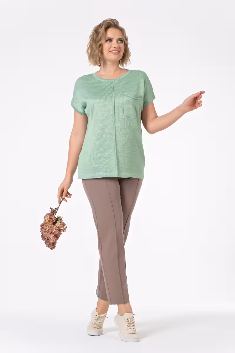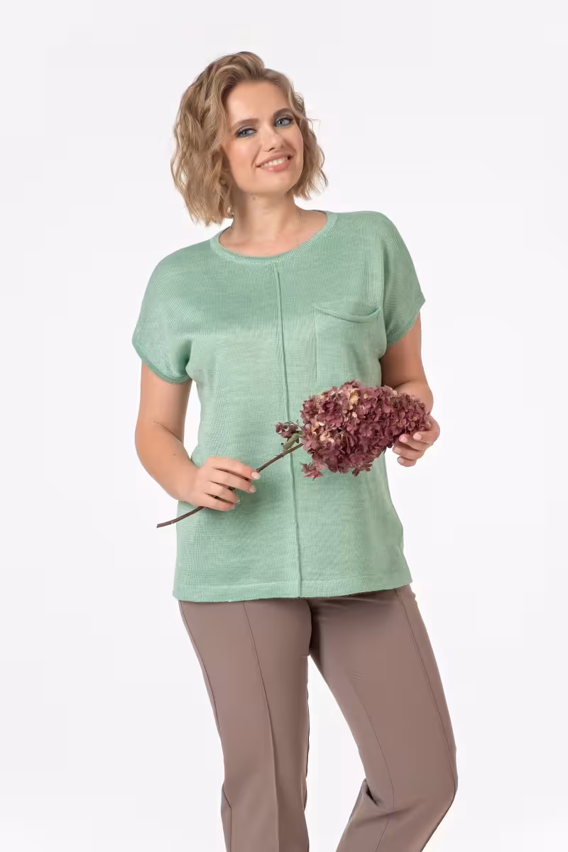 Этот джемпер из мягкого трикотажа станет основой для множества стильных образов. Прямой силуэт деликатно обрисовывает фигуру не сковывая движений. Короткие рукава делают модель идеальной для межсезонья и летних вечеров в кондиционируемых помещениях.Изюминкой дизайна стал декоративный шов по центру переда – такая деталь визуально вытягивает силуэт и придает джемперу более структурированный вид. Небольшой карман слева не только украшает но и остается функциональным элементом для мелочей.Круглый вырез горловины подчеркивает линию шеи и отлично сочетается с различными украшениями. Качественная кулирная гладь обеспечивает долговечность и сохранение формы после стирок.В деловом образе джемпер гармонично смотрится с прямыми брюками и жакетом. Для casual-прогулок его можно сочетать с джинсами или легкими брюками-бананами. Универсальный зеленый цвет освежает базовый гардероб и легко комбинируется с нейтральными и яркими оттенками.Модель подходит для офиса встреч с друзьями походов по магазинам и путешестви