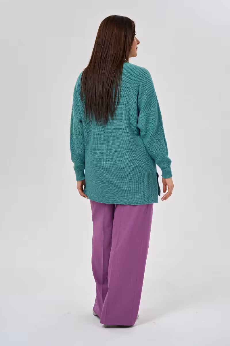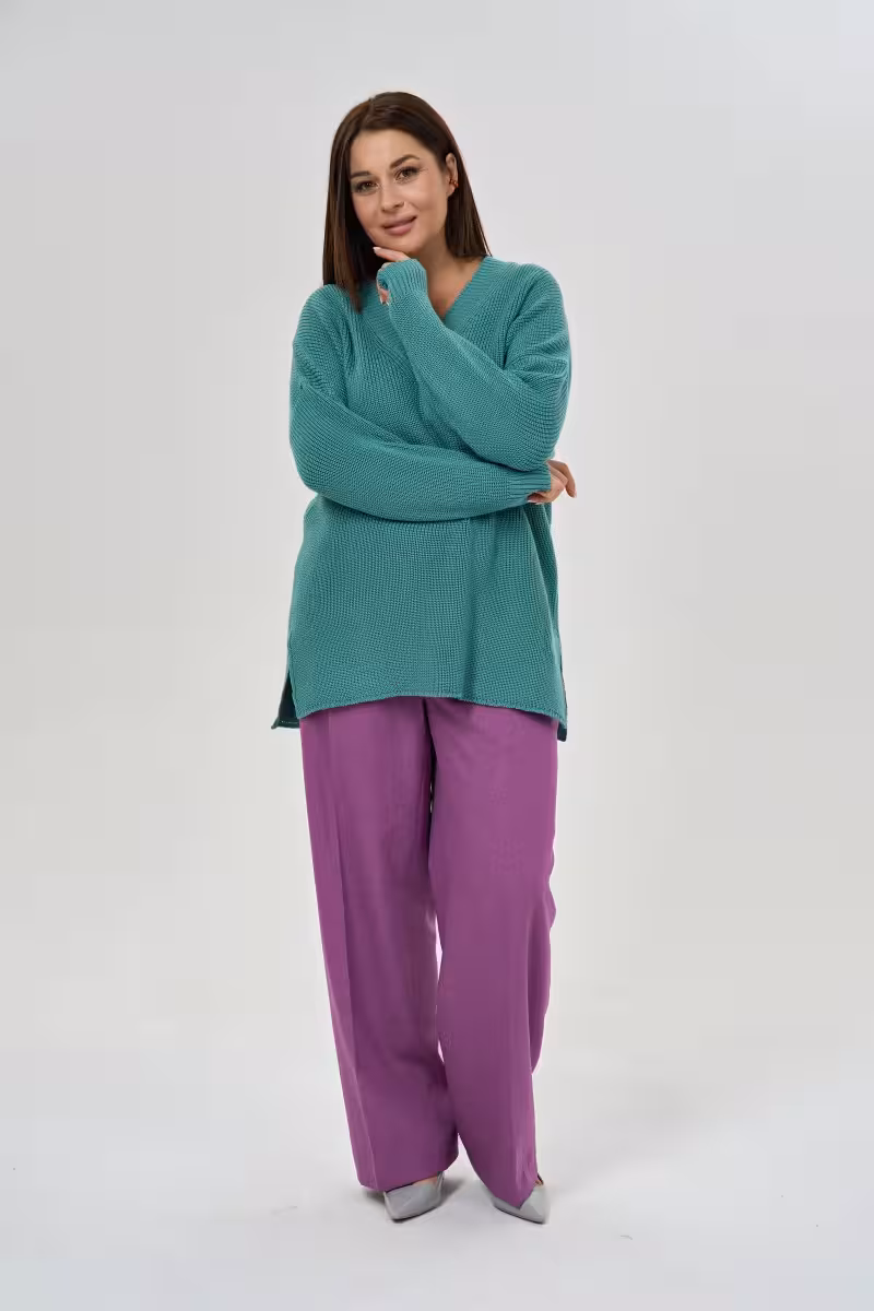 Этот джемпер крупной вязки дарит ощущение уютного комфорта в прохладные дни. V-образный вырез изящно подчеркивает линию декольте а прямой силуэт создает элегантный баланс между расслабленностью и утонченностью. Боковые разрезы добавляют современной динамики классическому образу.