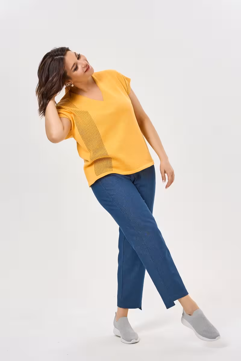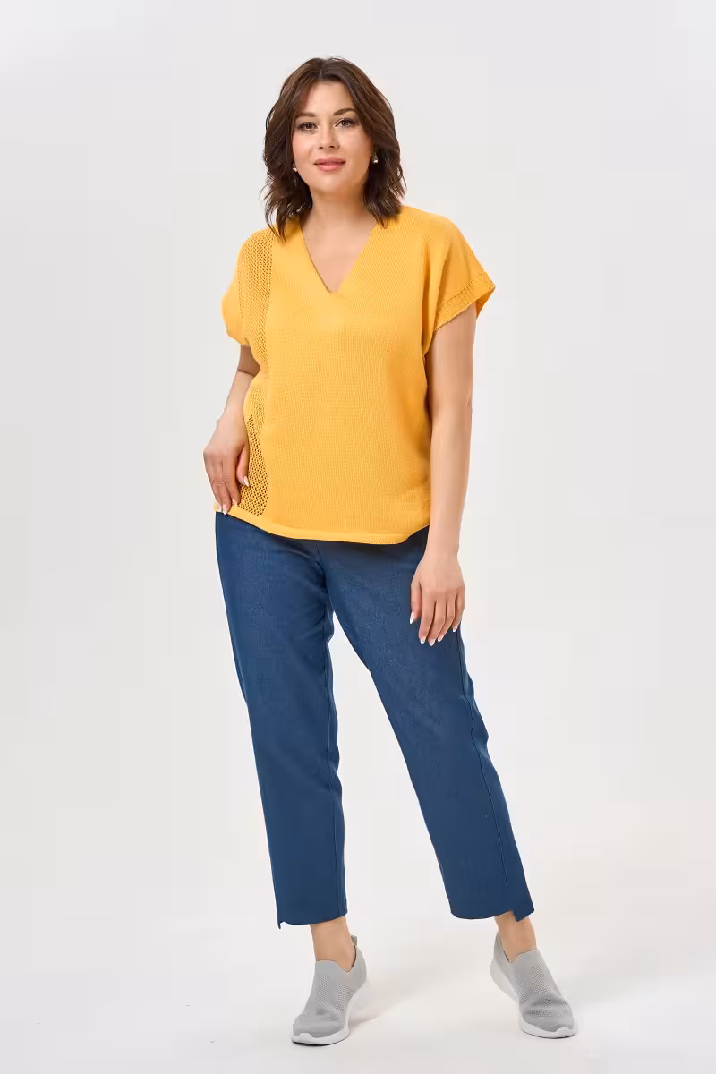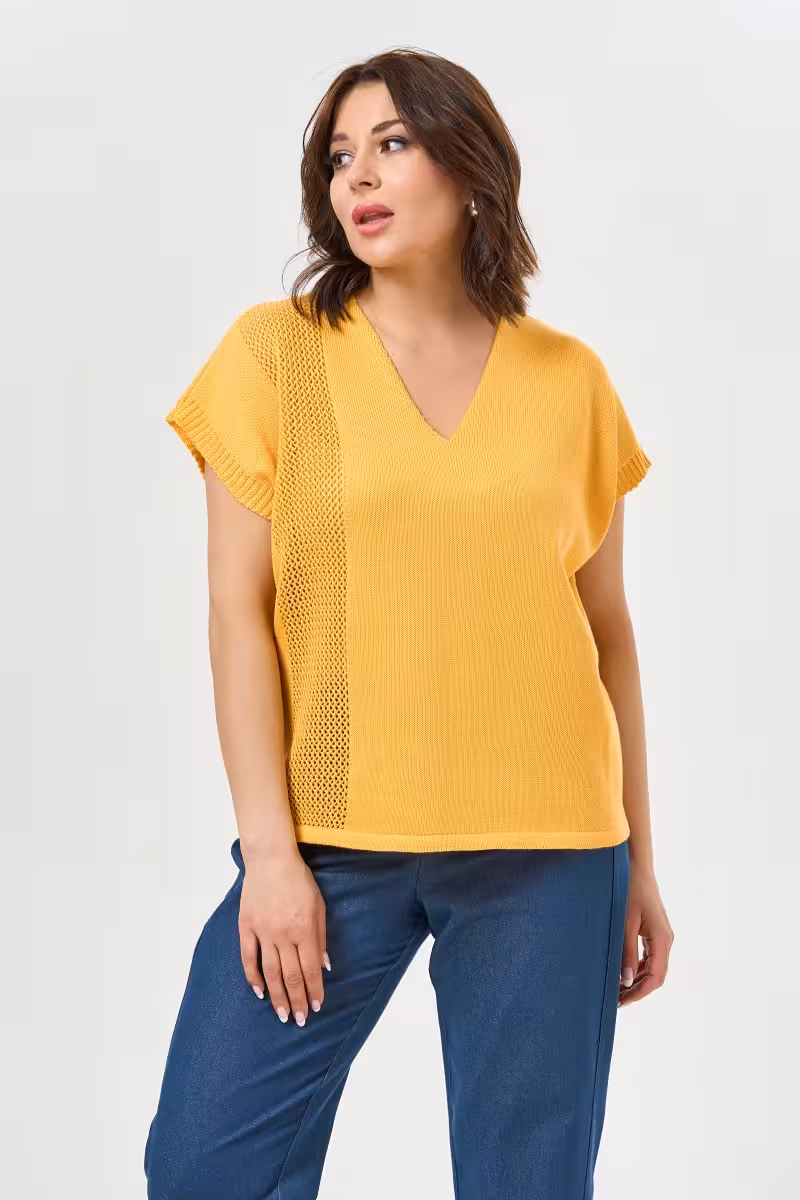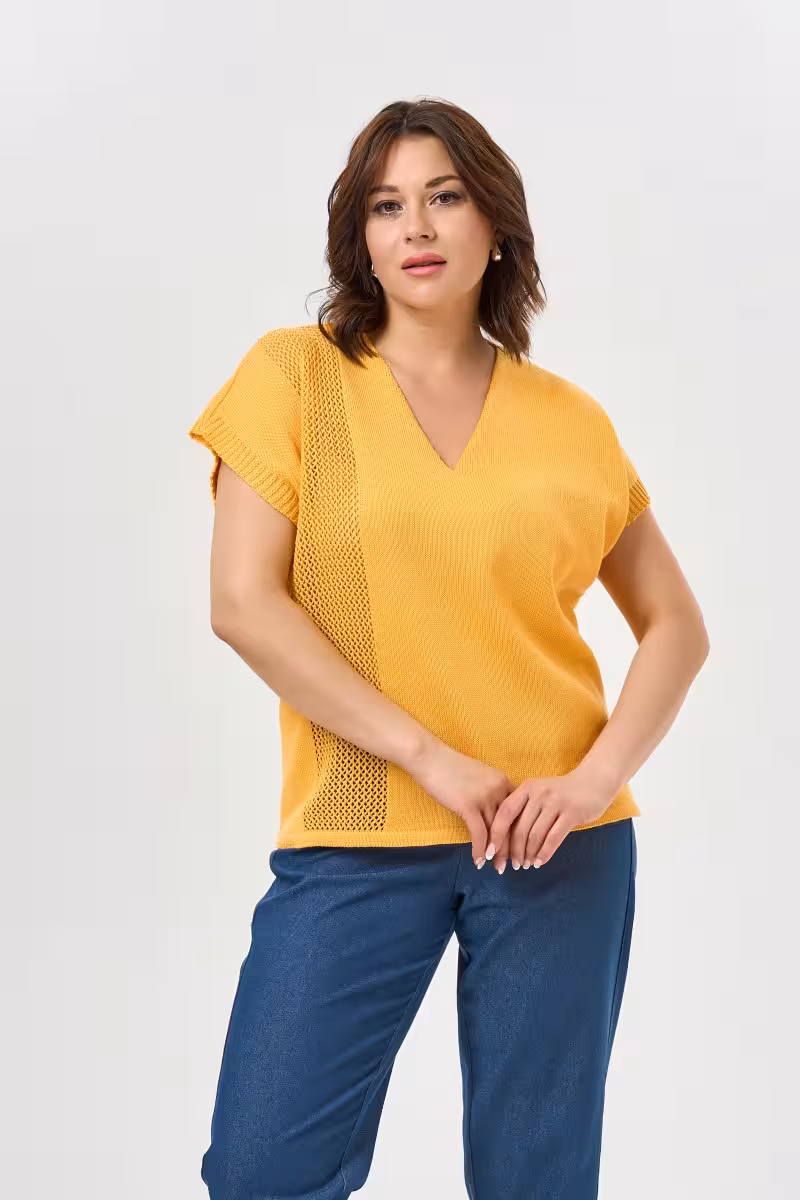Горчичный джемпер с V-вырезом станет ярким акцентом гардероба. Насыщенный солнечный оттенок поднимает настроение даже в пасмурные дни. Прямой силуэт создает непринужденный образ а V-образный вырез красиво подчеркивает линию декольте. Мягкая вязка из качественного трикотажа обеспечивает комфорт при носке. Короткие рукава делают модель универсальной для теплого сезона. В офисе джемпер отлично сочетается с деловыми прямыми брюками и жакетом. For casual образов подходят джинсы или свободные брюки-бананы. На прогулке или встрече с друзьями можно дополнить образ зауженными брюками. Модель подходит для путешествий благодаря практичности трикотажа. V-вырез позволяет носить украшения создавая акценты в образе. Горчичный цвет прекрасно комбинируется с базовыми оттенками гардероба.