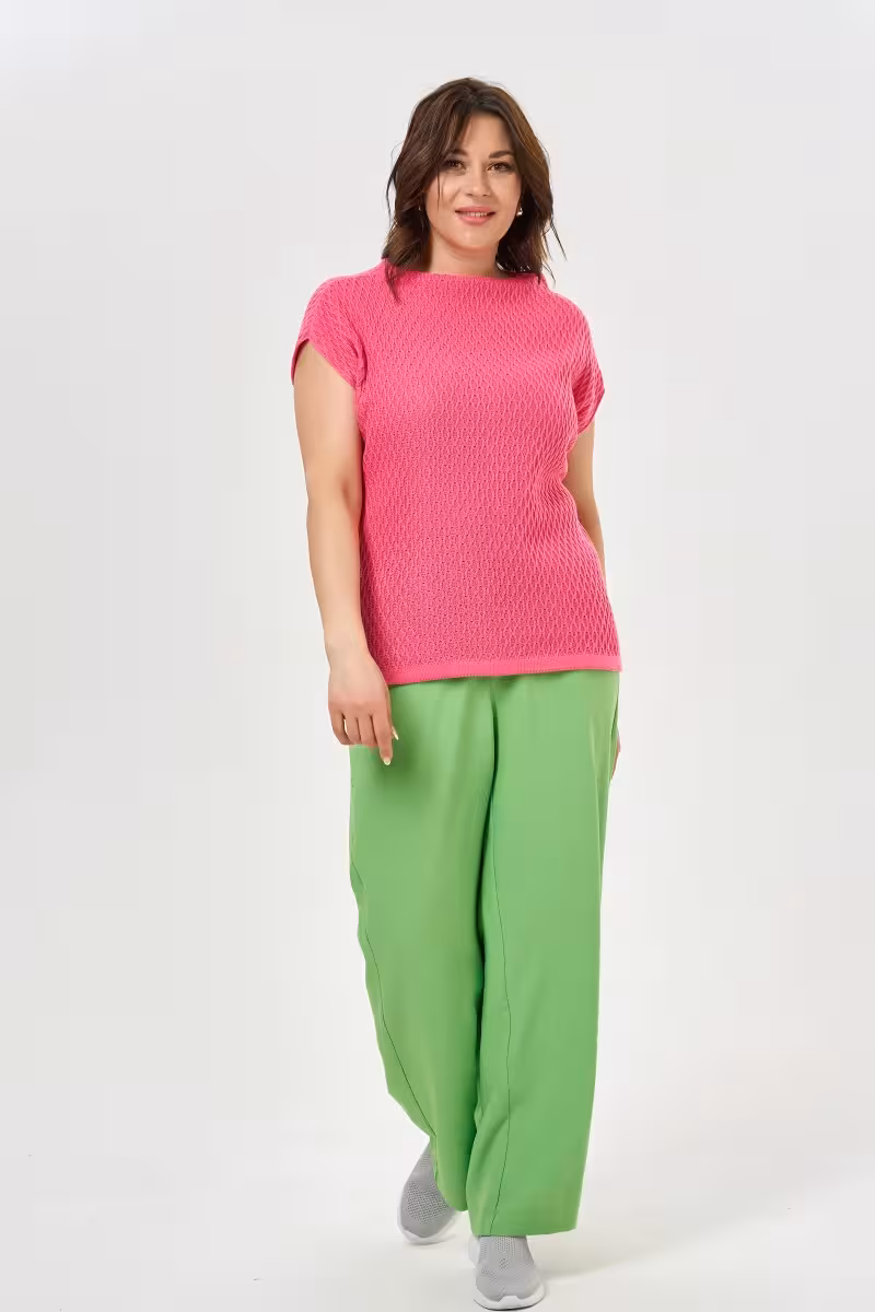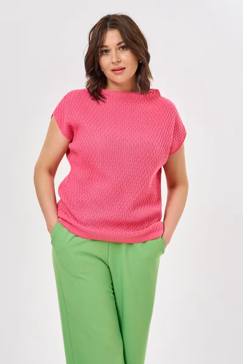 Джемпер с изящной полустойкой создает ощущение уверенности и комфорта одновременно. Фактура паутинка добавляет образу легкости и воздушности. Прямой силуэт подчеркивает естественные линии фигуры без лишней облегаемости.