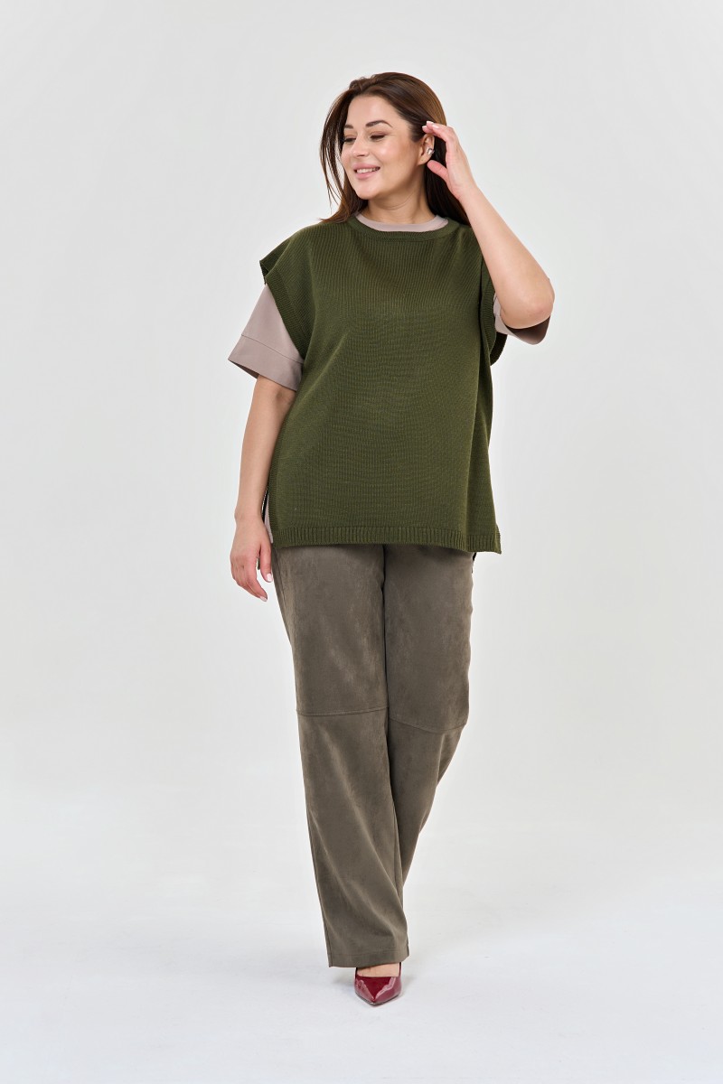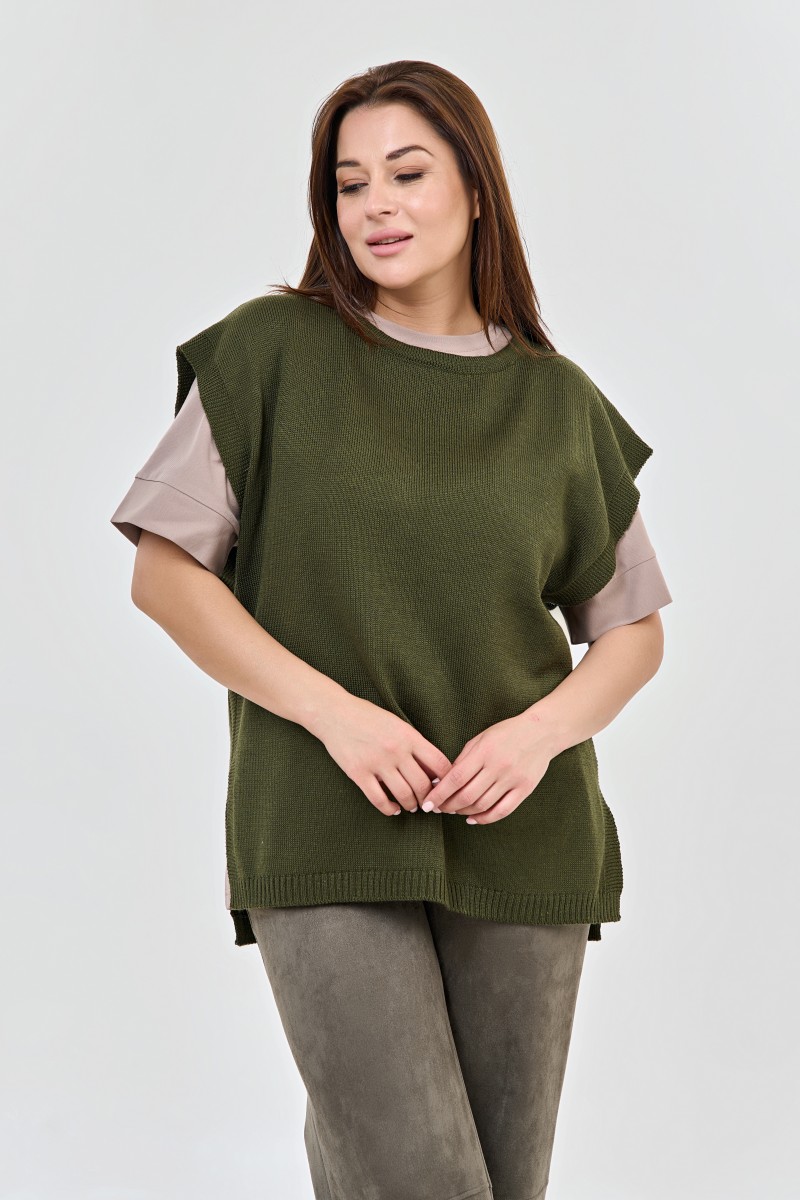 Жилет женский вязаный прямого силуэта с круглым вырезом горловины.Длина изделия ниже линии бедер спинка длинее на 3 см переда.