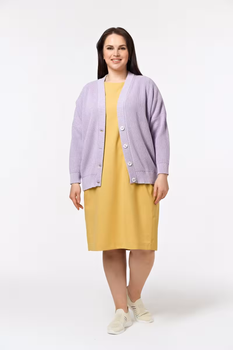 Мягкие объемные петли хлопковой пряжи создают ощущение домашнего уюта даже в деловой обстановке. Удлиненный силуэт визуально вытягивает фигуру и добавляет образу благородную сдержанность.