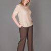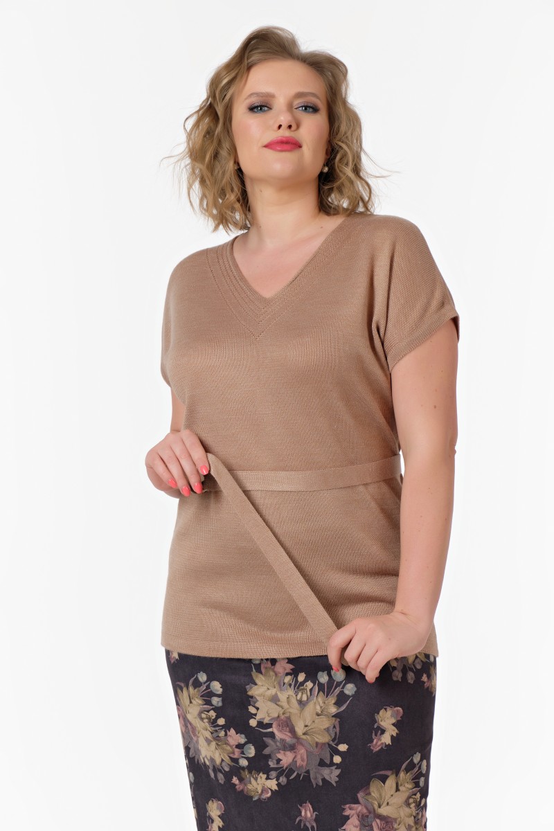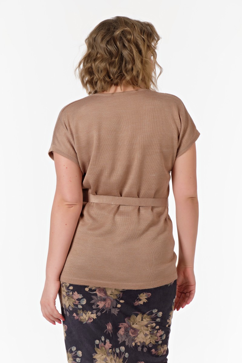 Джемпер женский вязанный прямого силуэта вырез горловины V-образный. Длина ниже линии бедер. Пояс полукольцами фиксируется на линии талии. Рукава короткие цельнокроеные.