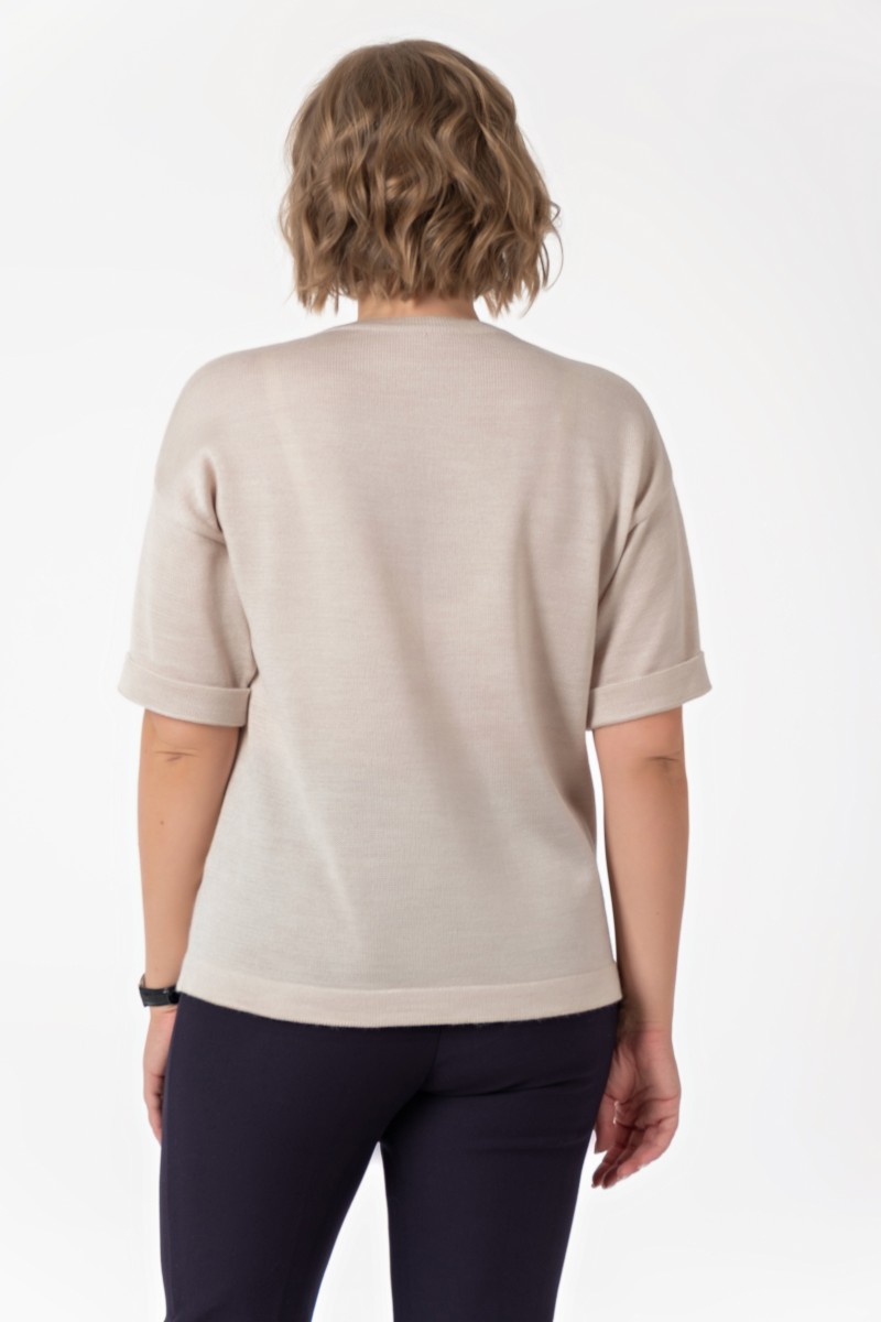 Джемпер женский вязанный (переплетение: кулирная гладь)/ прямого силуэта рукав втачной длиной ¼ по низу рукава отворот круглый вырез горловины обработанный бейкой. По нижней части переда справой стороны декоративное украшение в виде вышивки.