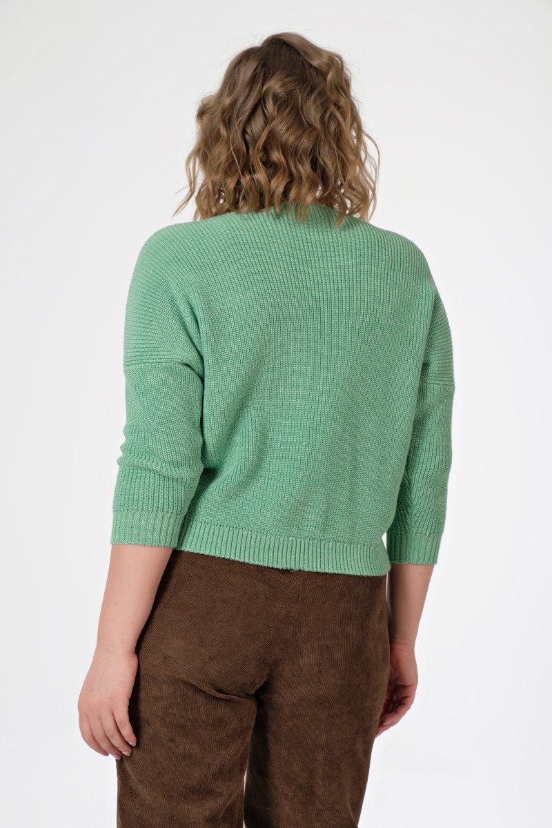 Джемпер женский вязанный (переплетение полуфанг)/ прямого силуэта/ рукава длинные цельнокроеные с членением выше локтя/ без воротника с вырезом по горловине в форме «лодочка».