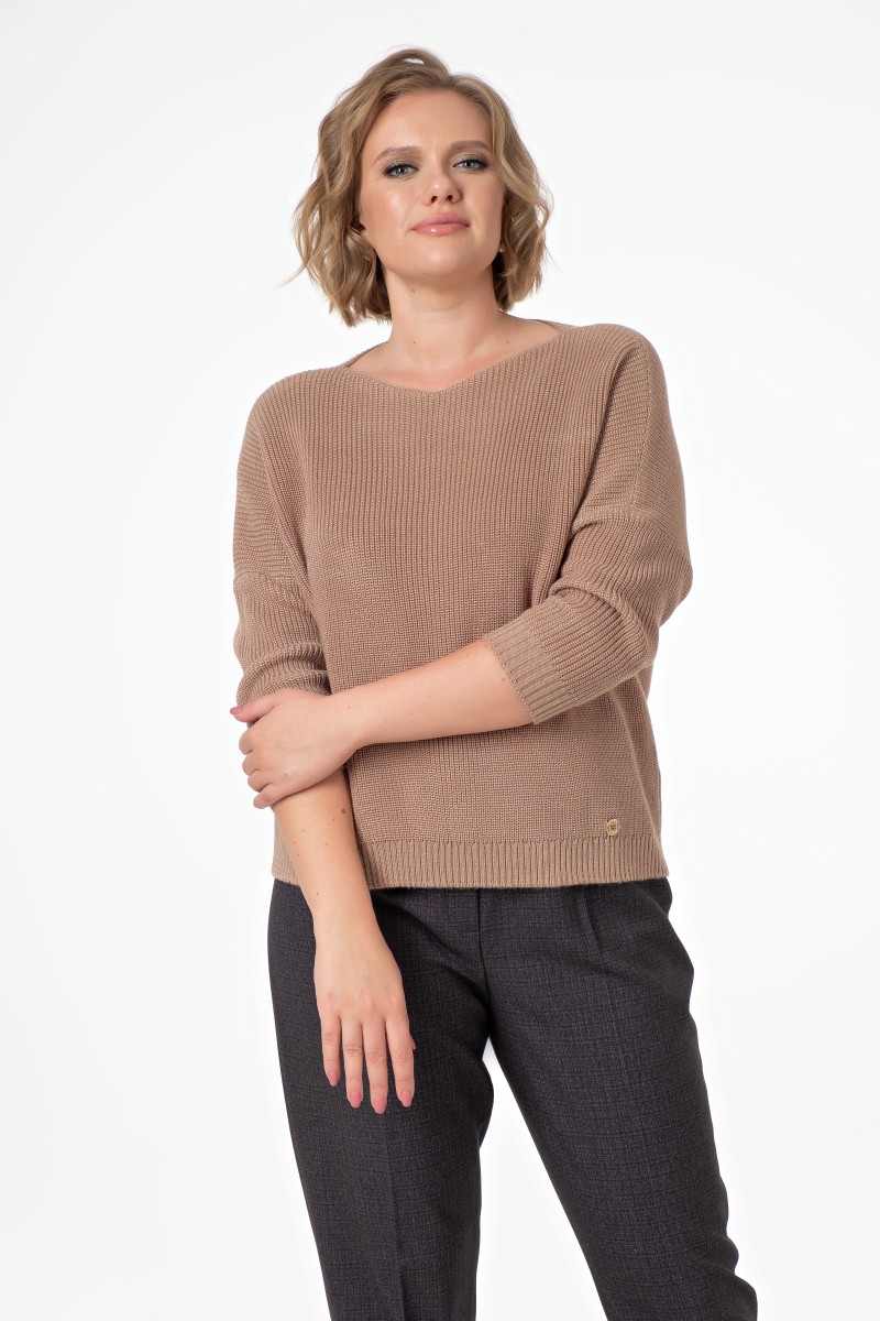 Джемпер женский вязанный (переплетение полуфанг)/ прямого силуэта/ рукава длинные цельнокроеные с членением выше локтя/ без воротника с вырезом по горловине в форме «лодочка».