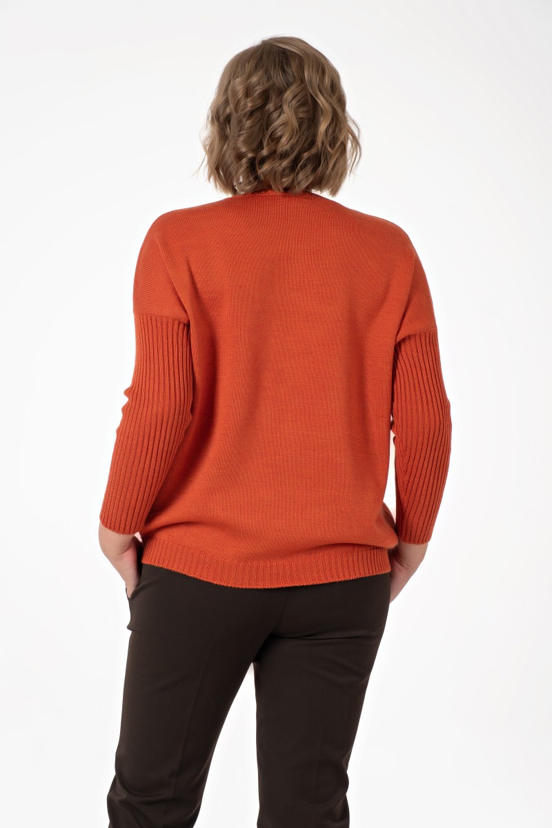 Джемпер женский вязанный (переплетение: кулирная гладь)/ прямого силуэта/ рукава длинные цельнокроеные с членением выше локтя c декоративным элементом на левом рукаве/ круглый вырез горловины обработанный бейкой.