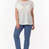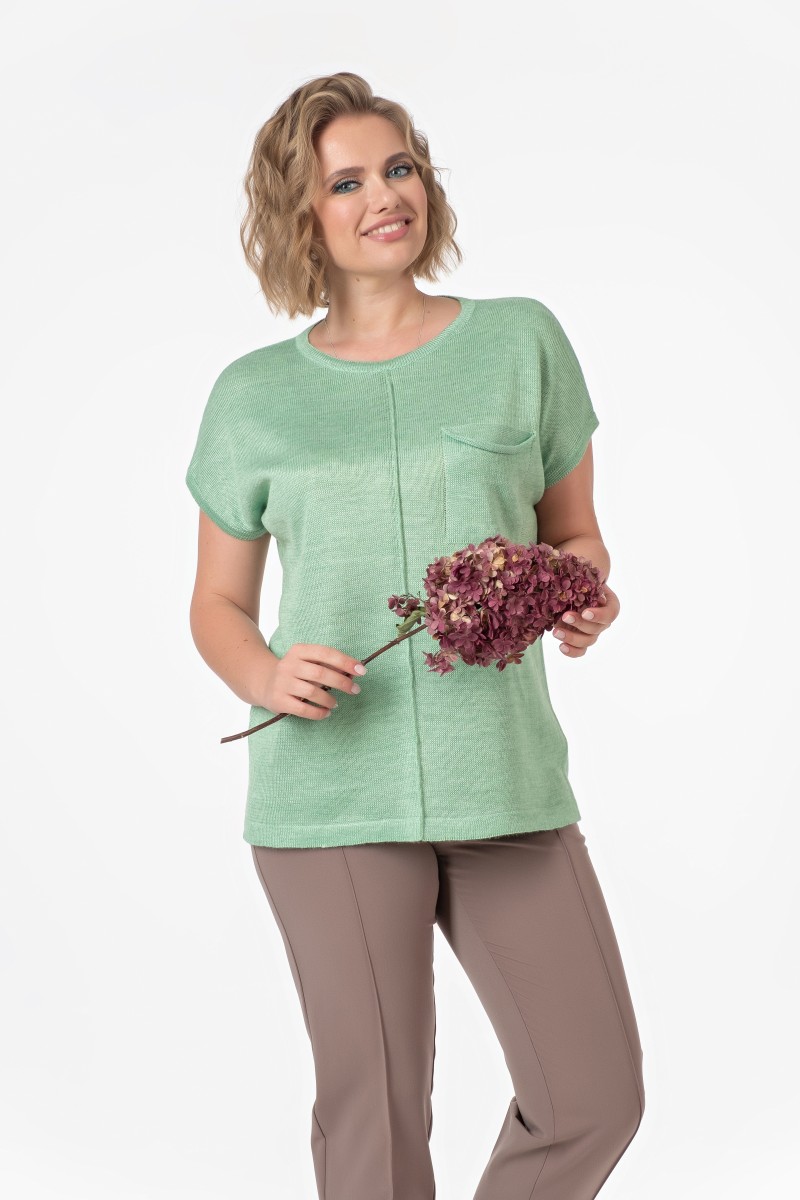 Джемпер женский вязанный (переплетение: кулирная гладь) прямого силуэта с короткими цельнокроеными рукавами. Перед с декоративным средним швом на левой половинке переда вывязанный карман. Горловина круглая обработана бейкой.