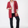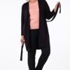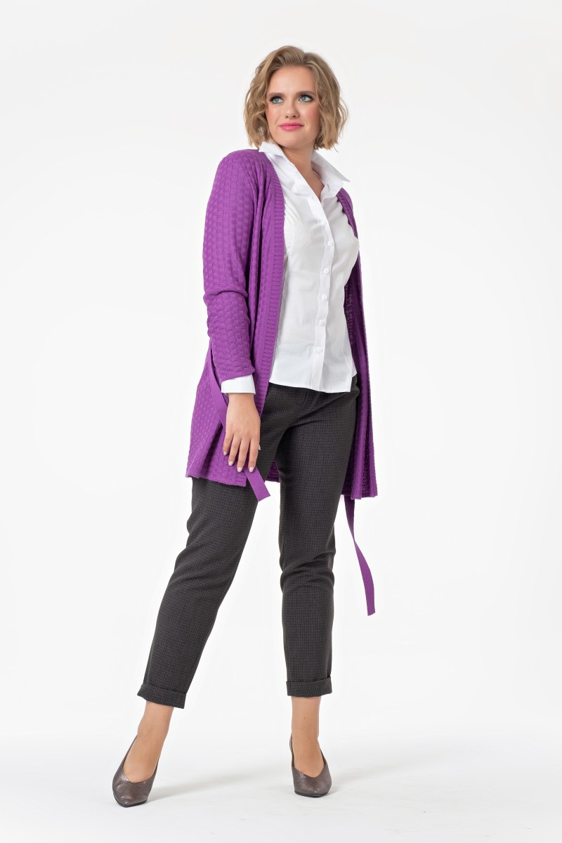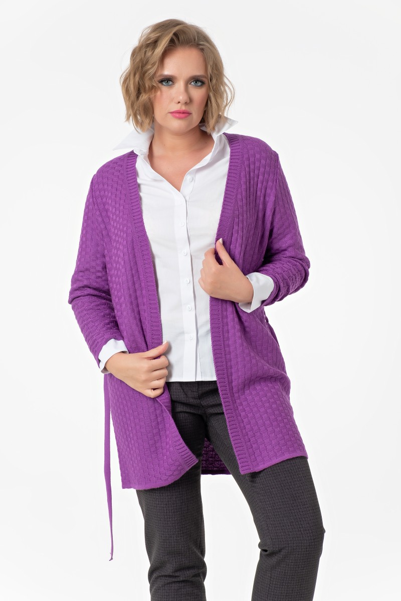Жакет женский трикотажный длина до колена без застежки. Горловина V-образная. Рукав втачной длинный. По линнии талии завязывающийся пояс продетый в шлёвку в боковом шве.