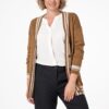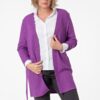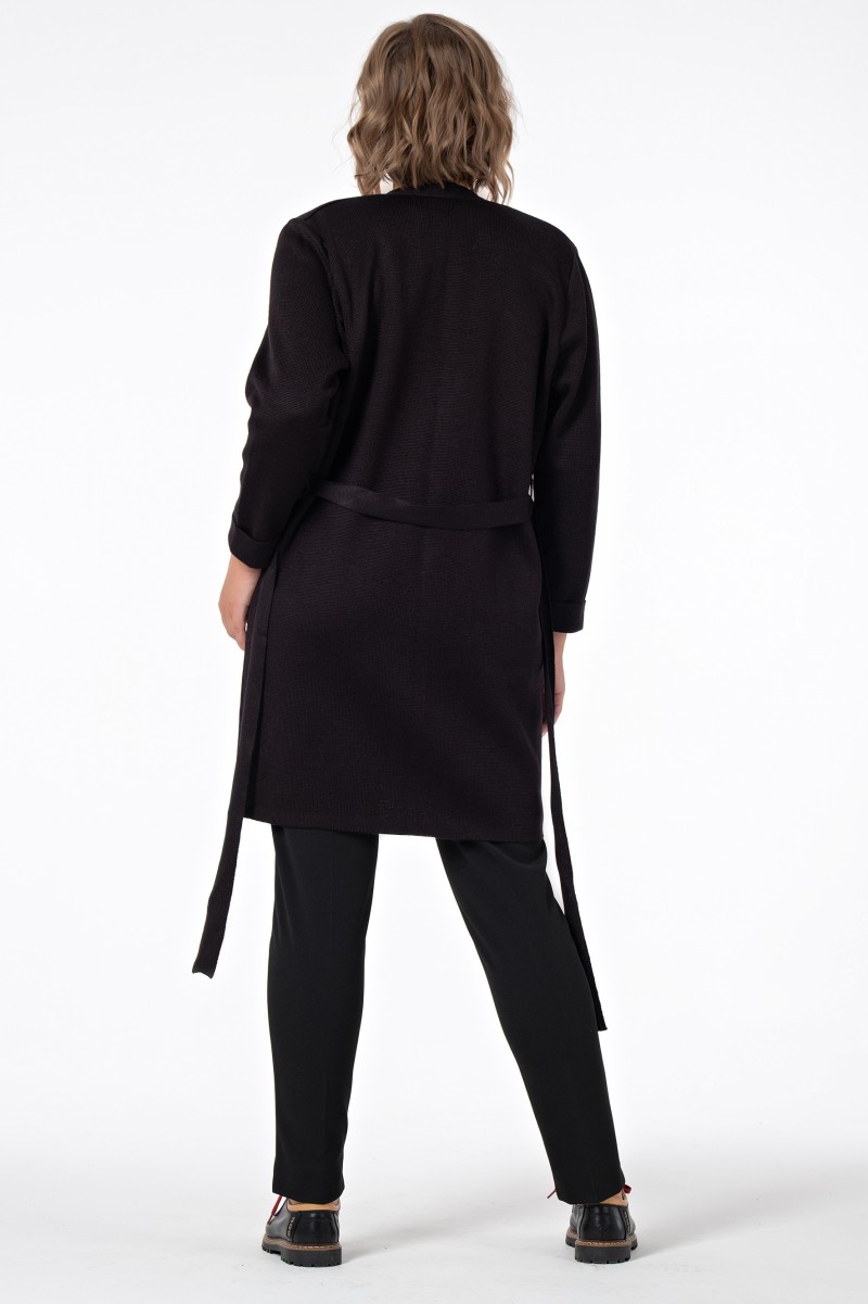 Жакет женский трикотажный (переплетение гладь) длиной выше колена без застежки с V-образной горловиной с завязывающимся на линии талии поясом продетым в шлёвки. Спинка без особенностей. Рукав втачной длинный с цельновывязаной отложной манжетой.