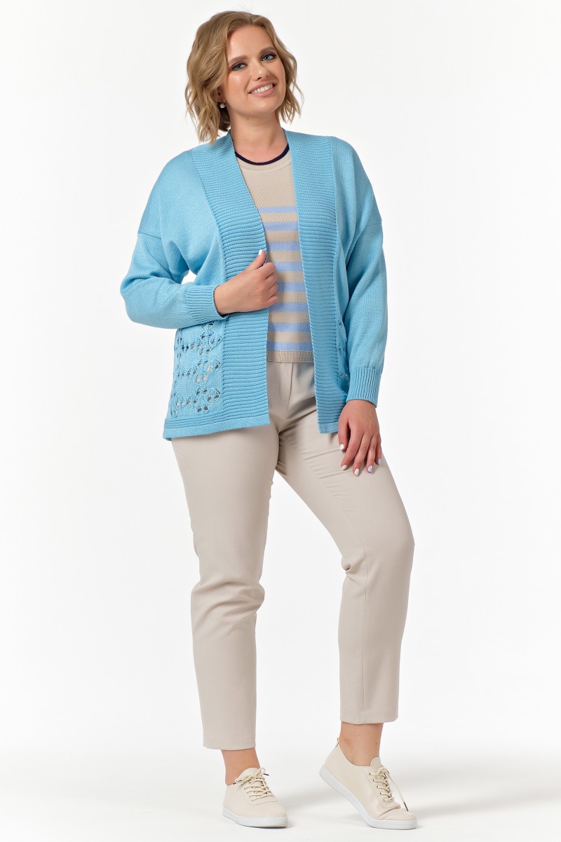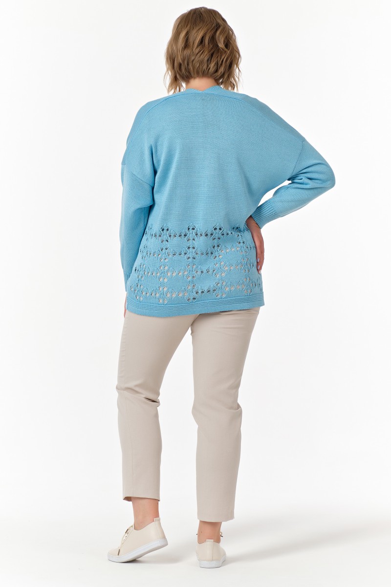 Жакет женский вязанный (переплетение: кулирная гладь + ажур)/ прямого силуэта длина до линии бедер без застежки. Рукава длинные цельнокроеные с членением выше локтя.