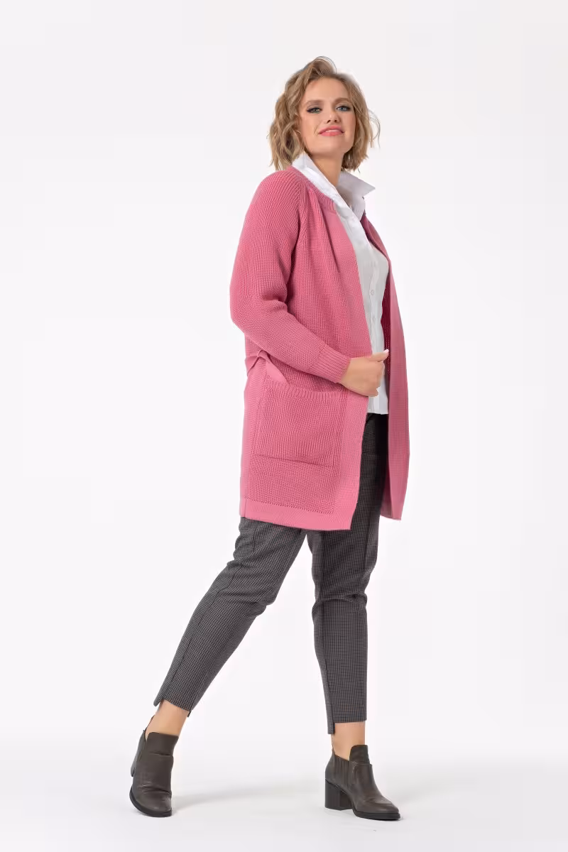 Этот кардиган словно создан для тех кто ценит комфорт без ущерба для стиля. Прямой силуэт до колена работает как мягкая броня – скрывает несовершенства и подчеркивает достоинства. Воротник-стойка придает образу структурность особенно когда кардиган надет поверх простой футболки или базового топа.Трикотажное полотно с фактурным переплетением приятно прилегает к телу не стесняя движений. Длинные рукава кроя реглан создают плавную линию от плеча до запястья. Два накладных кармана не только практичны но и добавляют непринужденности образу.Главная фишка – регулируемый пояс который позволяет носить кардиган как угодно. Распущенным для создания расслабленного силуэта или подпоясанным для подчеркивания талии. С прямыми деловыми брюками получается элегантный офисный лук. Зауженные джинсы и ботинки превращают его в идеальный выбор для прогулок по городу. А надетый поверх платья он становится частью многослойного образа для вечернего выхода. Этот кардиган легко адаптируется под настроение и планы дня.