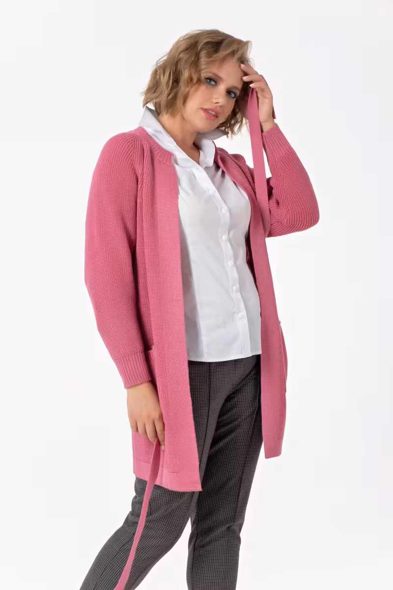 Кардиган прямого кроя с поясом и стойкой