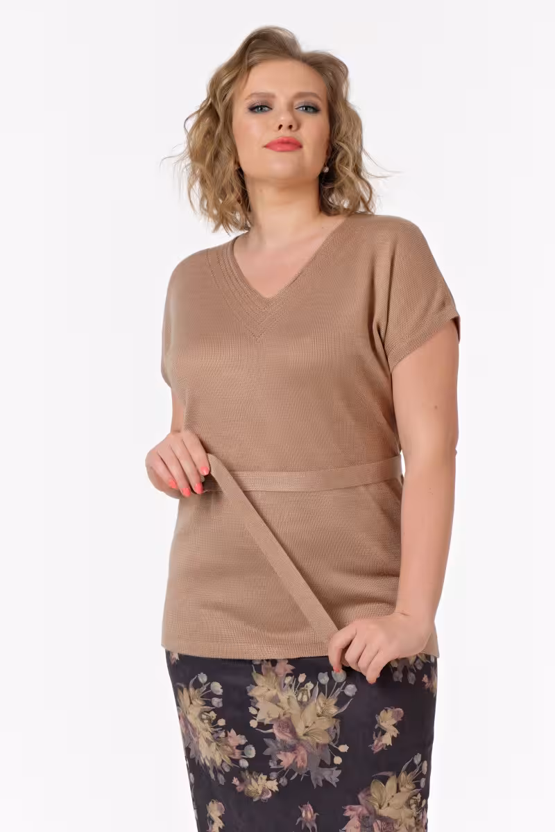 Этот вязаный джемпер станет основой для множества стильных образов. Прямой силуэт не сковывает движения а благородный трикотаж дарит ощущение комфорта в течение всего дня. V-образный вырез визуально удлиняет шею и добавляет изящества образу. Главная особенность модели – пояс который можно завязать на талии создавая более женственный силуэт. Длина ниже бедер позволяет носить джемпер с самыми разными низами. Короткие рукава делают модель универсальной для межсезонья.В офисе джемпер прекрасно сочетается с прямыми брюками и жакетом для делового образа. На прогулке его можно дополнить свободными брюками-бананами и удобной обувью. Для вечернего выхода стоит выбрать зауженные брюки или юбку. Мягкий трикотаж приятен к телу и сохраняет форму после стирки.Нейтральный бежевый оттенок легко вписывается в любую цветовую палитру гардероба. Такой джемпер незаменим для путешествий – он занимает минимум места в чемодане но позволяет создать элегантный look в любой ситуации.