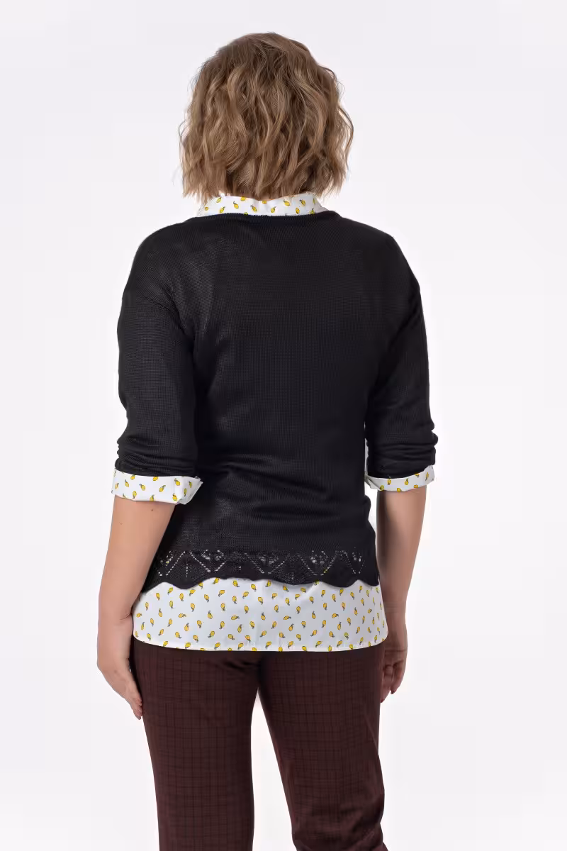 Черный джемпер прямого силуэта с изящными ажурными деталями по краям создает ощущение легкой элегантности. Мягкий трикотаж окутывает силуэт не сковывая движений а круглый вырез подчеркивает линию шеи.