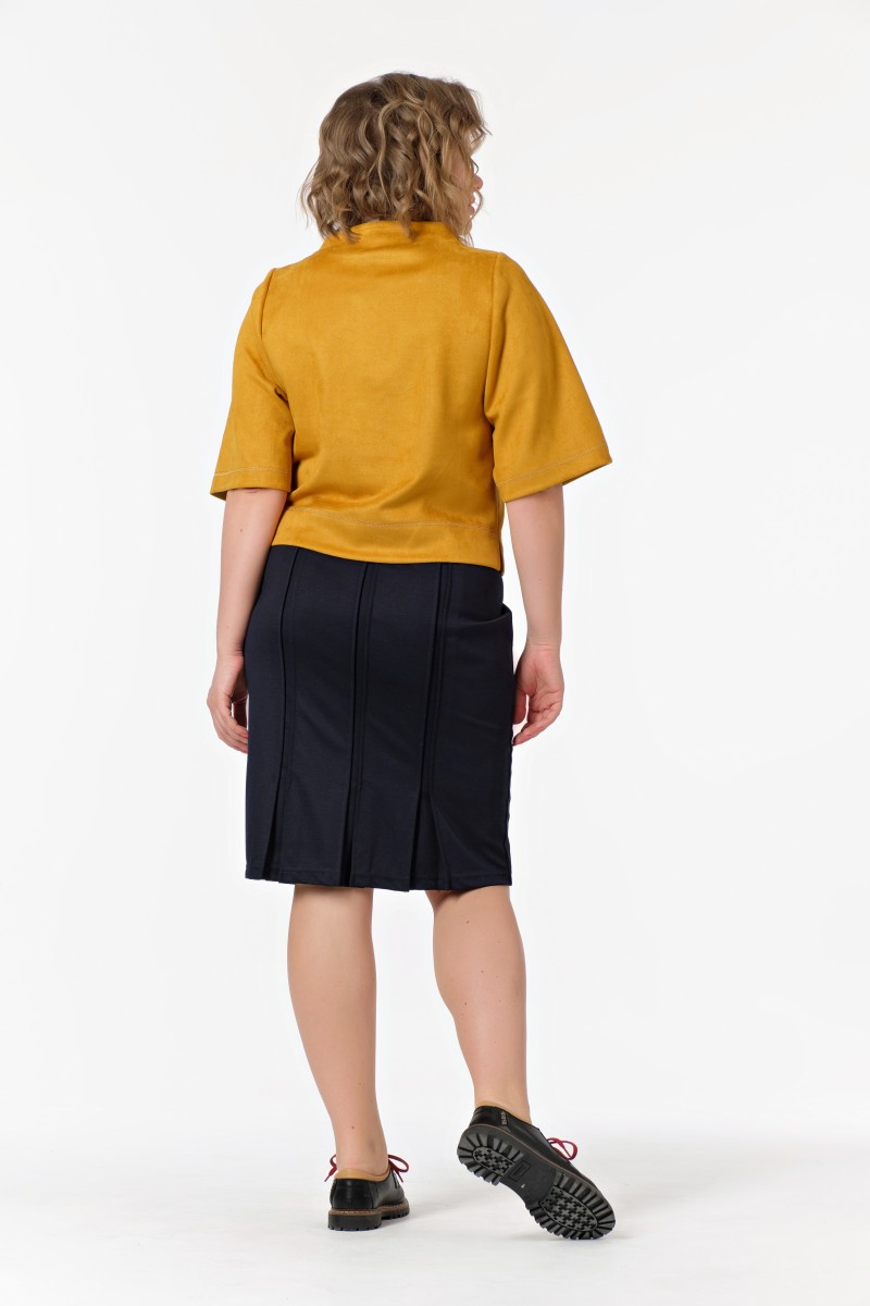 Эта классическая юбка с зауженным силуэтом станет основой для создания элегантных образов в стиле modern classic. Длина ниже колена подчеркивает женственность и создает безупречную линию силуэта. Трикотажное полотно обеспечивает комфорт в течение всего дня и мягко облегает фигуру.Особый шарм модели придают три декоративные складки на заднем полотне – они создают интересную игру линий и добавляют динамику классическому крою. Удобный пояс на широкой вставке обеспечивает идеальную посадку и комфорт при носке.Зауженный к низу силуэт визуально вытягивает фигуру и создает элегантную линию от бедер к коленям. Эта модель plus size разработана с учетом особенностей фигуры и подчеркивает все достоинства силуэта.Юбка отлично сочетается с блузками для деловых встреч с топами для вечерних выходов и с джемперами для повседневных образов. Трикотажная ткань не сковывает движения делая модель идеальным выбором для офиса прогулок и важных мероприятий.
